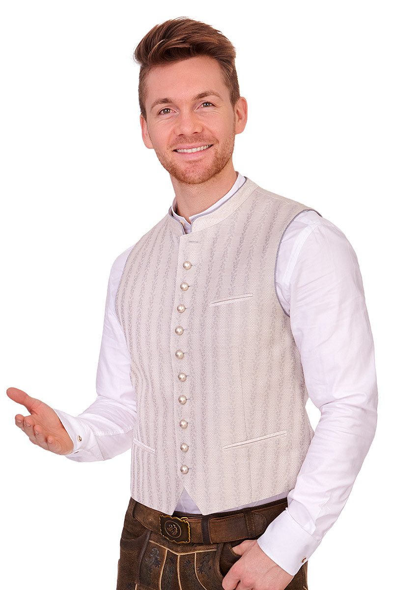 Diese elegante Trachtenweste namens Silvan, ein festliches Obergewand im hervorragenden Design von Alpenwahnsinn, besteht vorn aus exklusivem, schimmerndem Jacquard und hat einen geschmackvollen Stehkragen sowie eine schicke Knopfleiste. Das grandiose Streifen-Webmuster aus feinen Blätterranken und quadratisch gepunkteten Streifen wirkt je nach Lichteinfall heller oder dunkler. Der Kragen des schmucken Gilets ist aus Kontrast-Jacquard im feinen Ornamentik-Look gefertigt und - ebenso wie die Armausschnitte - schön mit silbernem Kontraststoff abgepaspelt. Links gibt es eine Brusttasche und vorn zwei Eingrifftaschen, allesamt als doppelte Paspeltaschen aus Kontrast-Jacquard gefertigt. Herrliche Kugelknöpfe in Mattsilber machen die Vorderseite perfekt. Der fein glänzende Westenrücken aus Jacquard mit zartem Ornamentik-Webmuster verfügt über einen verstellbaren Rückenriegel mit silberner Schnalle für den perfekten Sitz. Das angenehme Innenfutter garantiert einen tollen Tragekomfort. Bitte beachten Sie ab Размер 58 die Übergrößenzuschläge.