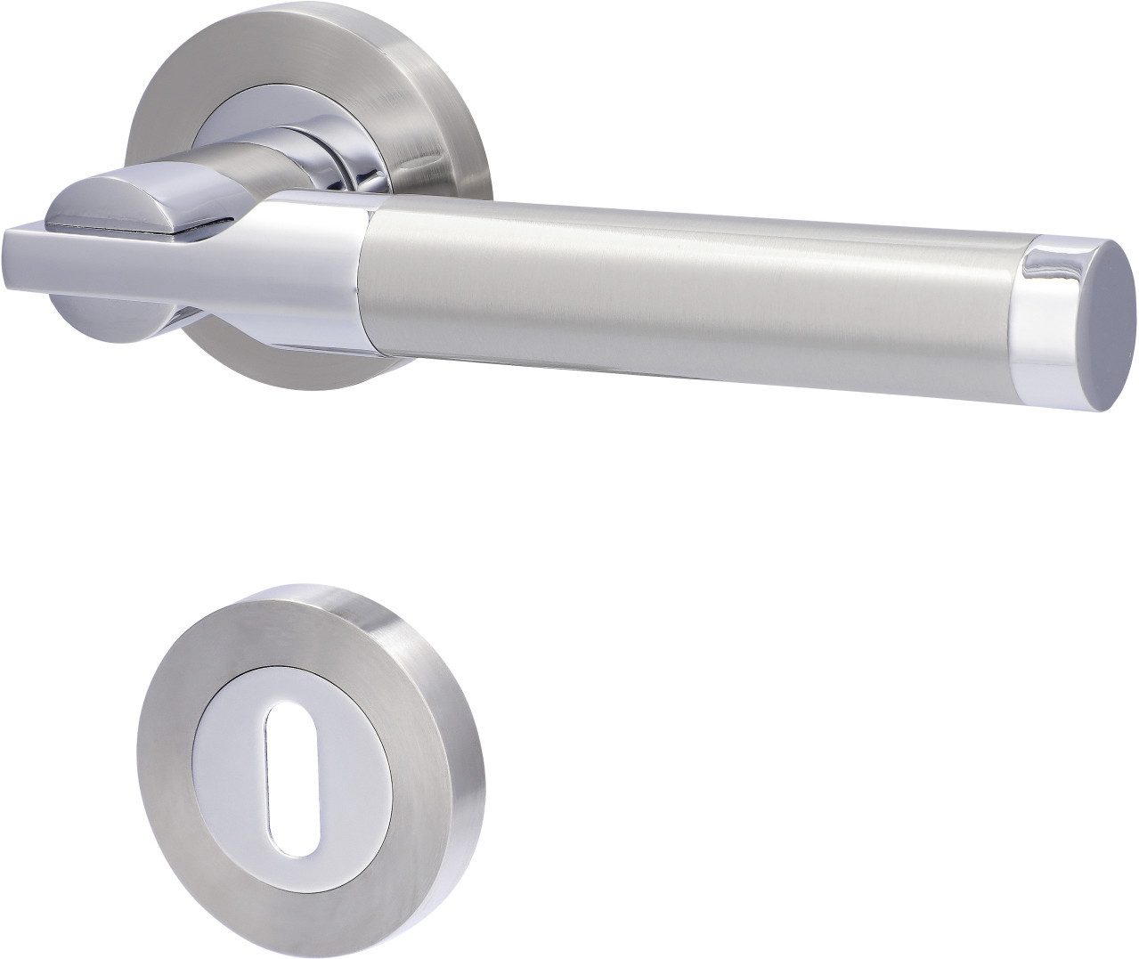 Rosettengarnitur Solid 6-R in Edelstahl poliert / satiniert für Zimmertüren. Die Garnitur verfügt über eine Rückholfeder und gewährleistet somit einen dauerhaft waagrechten Sitz des Drückers. Die Garnitur ist passend für alle gängigen Türen mit einer Türstärke von 37 - 42 mm.