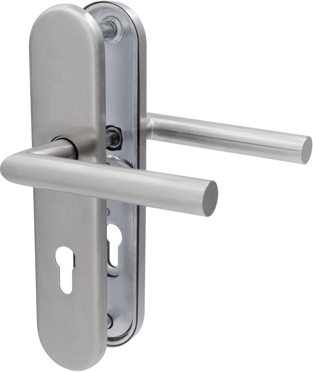 Sicherheitsbeschlag Security Moskau in Edelstahl satiniert für Haustüren. Der Sicherheitsbeschlag ist mit einer stabilen Unterkonstruktion ausgestattet. Die Garnitur ist mit einer 92 mm Profilzylinder Lochung versehen und passend für alle Türen mit einer Türstärke von 67 - 72 mm.