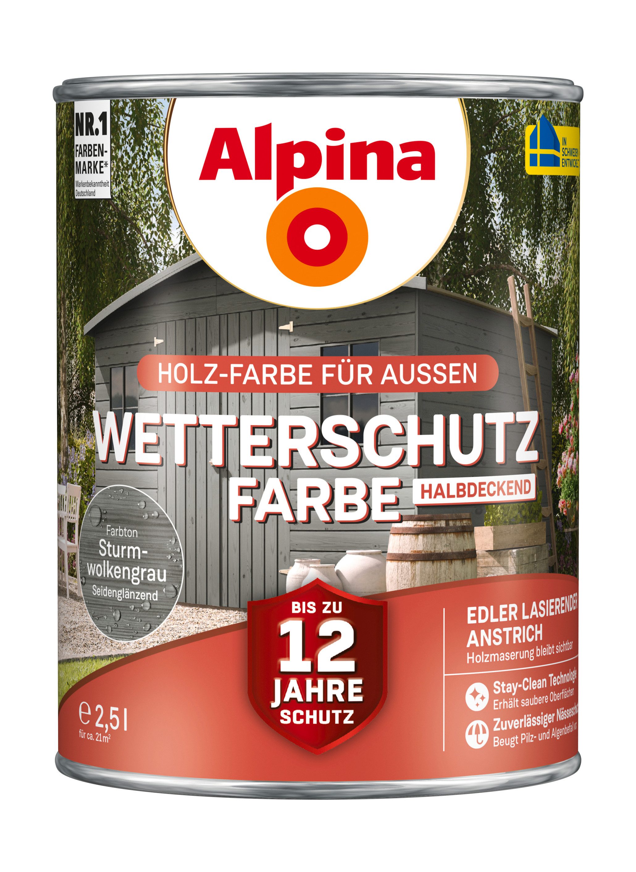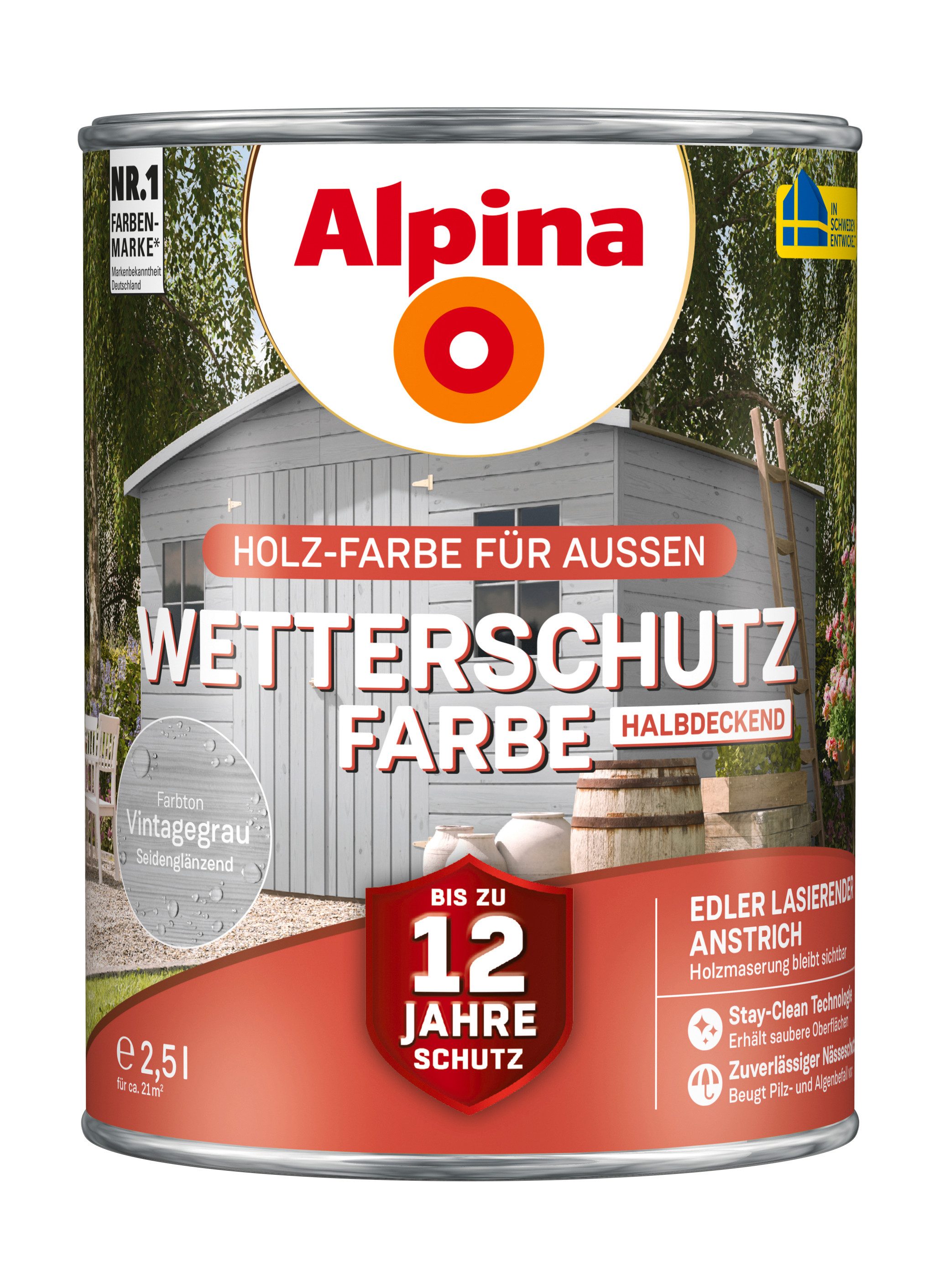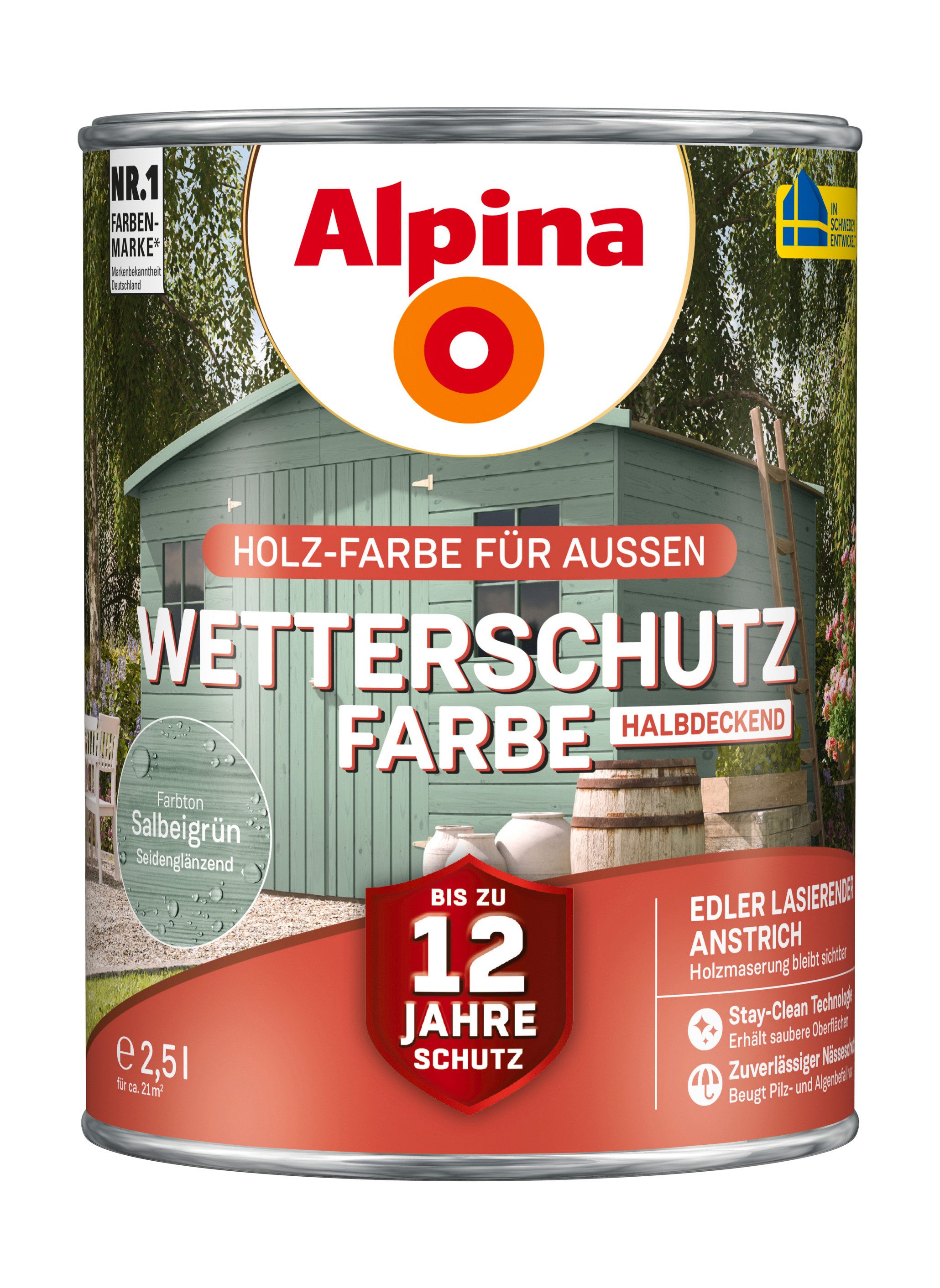 Alpina Wetterschutz-Farbe halbdeckend vereint das Beste aus zwei Produkten und ist die ideale Mischung aus Wetterschutzfarbe und Lasur für den Außenbereich. Bietet einen halbdeckenden Anstrich. Neuartige Stay-Clean Technologie vermindert die Schmutzanhaftung deutlich, schafft lang anhaltende, saubere Oberflächen. Natürliche Holzmaserung mit modernem Farbton. Ultraelastisch, nicht abblätternd.