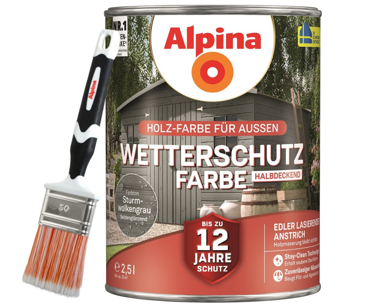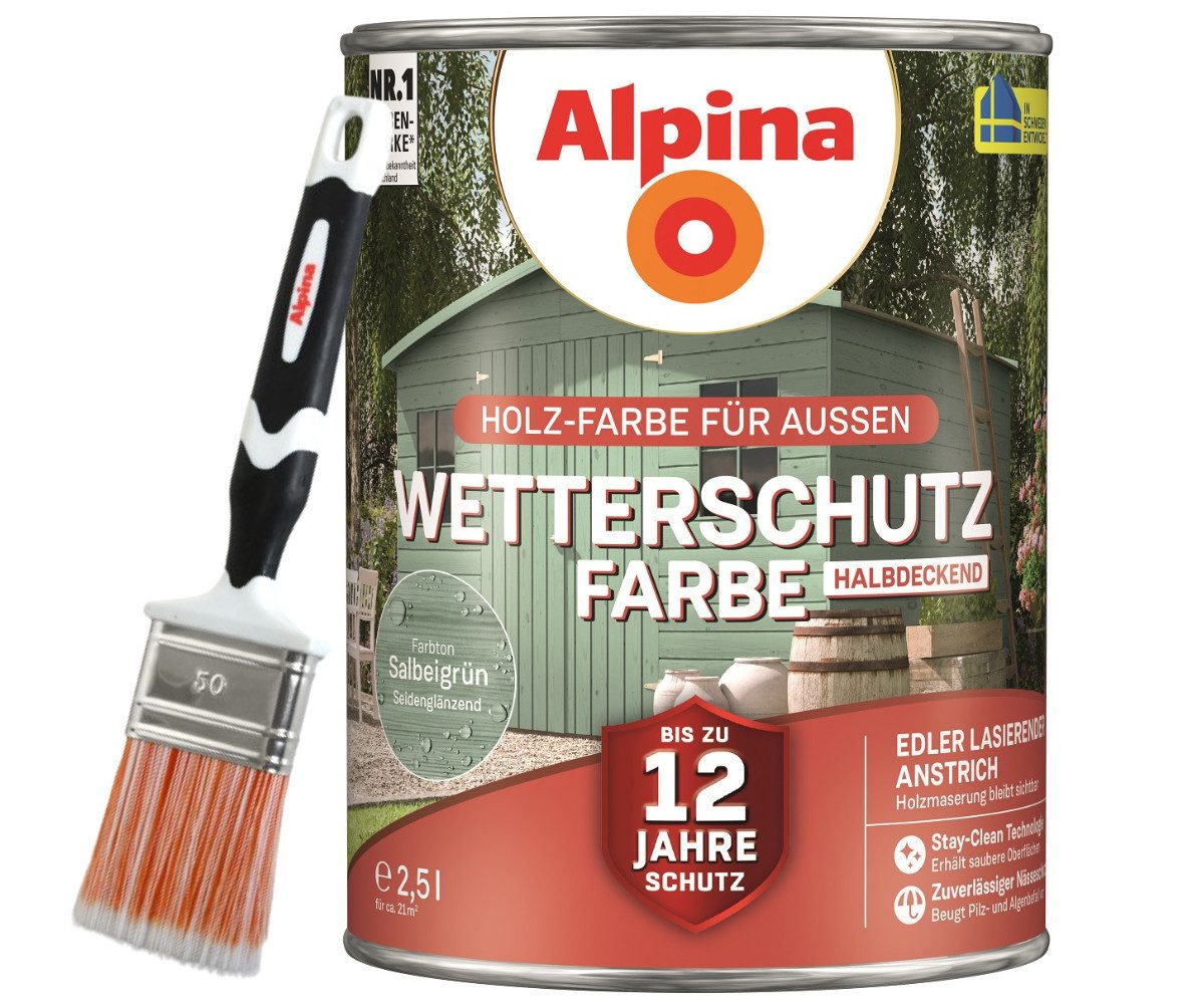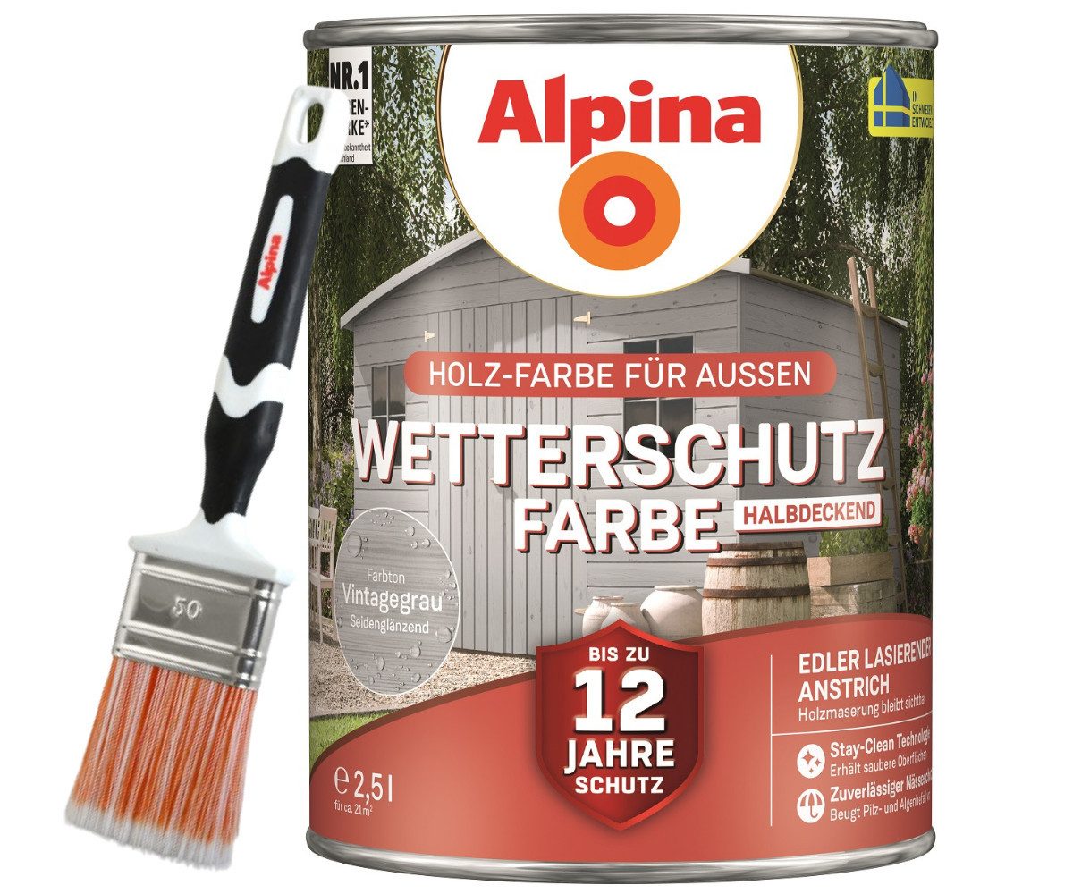 Alpina Wetterschutz-Farbe halbdeckend vereint das Beste aus zwei Produkten und ist die ideale Mischung aus Wetterschutzfarbe und Lasur für den Außenbereich. Bietet einen halbdeckenden Anstrich. Neuartige Stay-Clean Technologie vermindert die Schmutzanhaftung deutlich, schafft lang anhaltende, saubere Oberflächen. Natürliche Holzmaserung mit modernem Farbton. Ultraelastisch, nicht abblätternd.