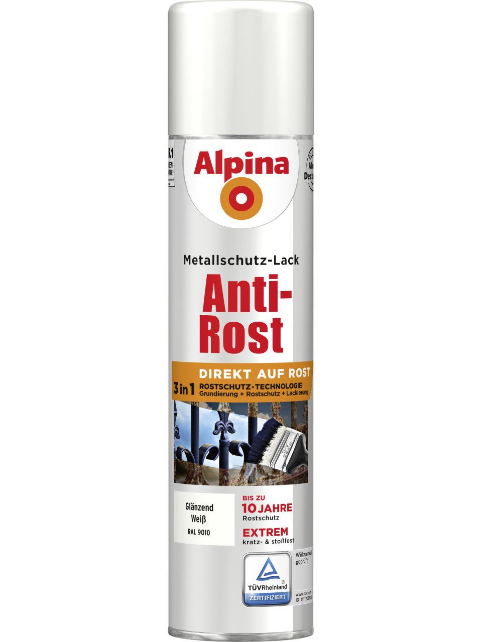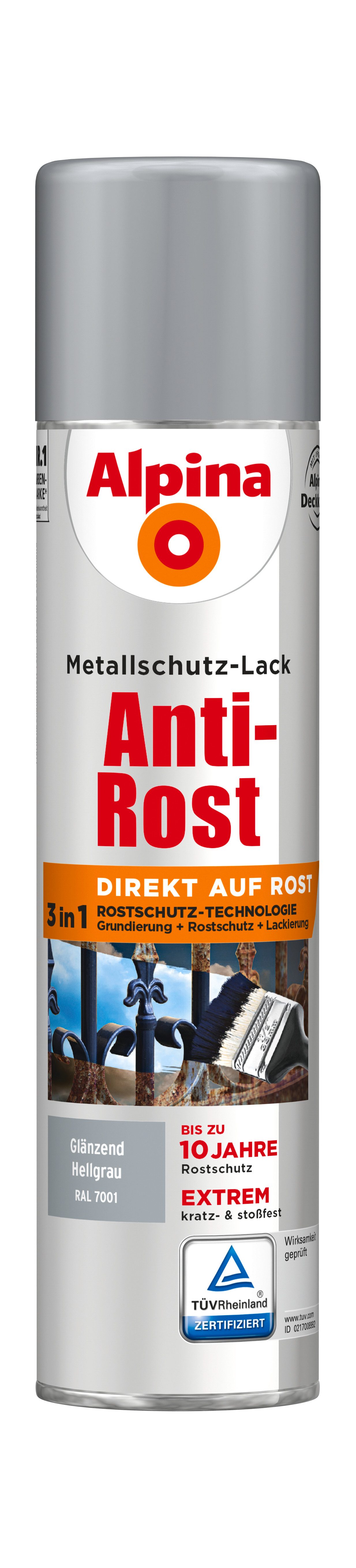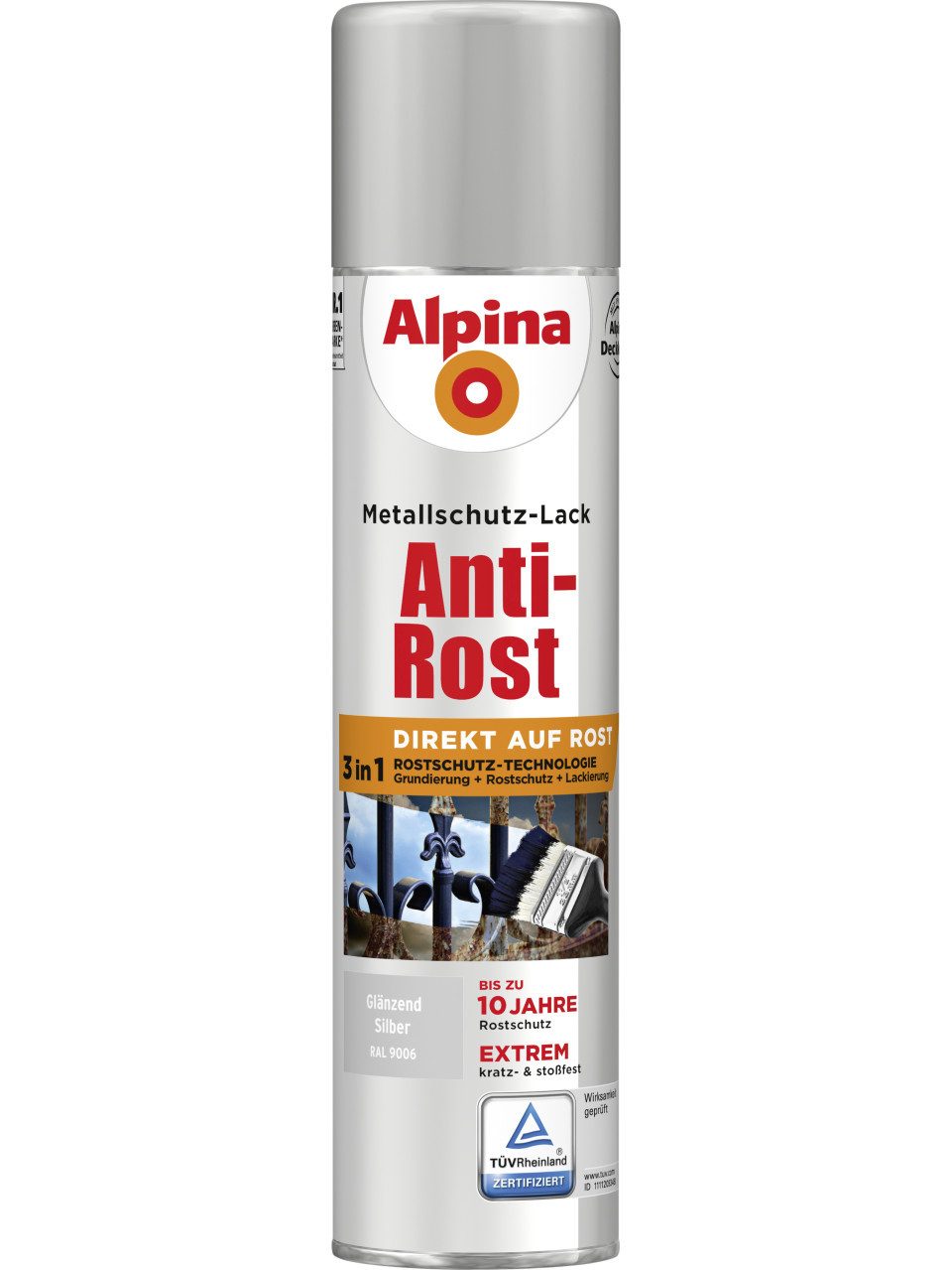 Verarbeitungshinweis | 1. Vorbereitung: Untergründe müssen tragfähig, sauber, trocken und fettfrei sein. Losen Rost und abplatzenden Lack entfernen. Glatte Oberflächen anschleifen und Schleifstaub entfernen. Schleifstaub nicht einatmen. Zink, Kupfer, Aluminium mittels ammoniakalische Netzmittelwäsche vorbereiten. Dann mit Alpina Spezial-Haftgrund vorstreichen. 2. Auftrag: Ideale Verarbeitung zwischen 8 und 21° C. Dose 3 Minuten gut schütteln. Auf Altanstrichen einen Testsprühgang durchführen und 1 – 2 Stunden warten. Wenn Reaktionen wie z. B. Blasen oder Oberflächenstörungen auftreten, Altanstrich entfernen. Anschließend mehrere dünne Schichten Alpina Anti-Rost Metallschutz-Lack sprühen. Sprühentfernung ca. 25 cm. Für einen lang anhaltenden Rostschutz sind 4 – 5 Sprühaufträge erforderlich. NICHT mit AcrylLack überarbeiten. Wartezeit zwischen den Aufträgen ca. 15 – 20 Minuten. |