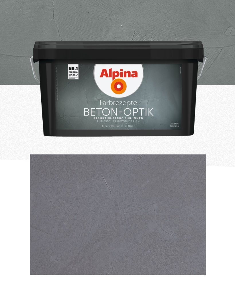Verarbeitungshinweis | 1. BETON-OPTIK hellgrau Basis mit dem an-gefeuchteten Alpina ROLLER aufrollen ... 2. ... und mit der Alpina EFFEKT-KELLE in kurzen Bewegungen kreuz und quer strukturieren. Die Alpina EFFEKT-KELLE an der Kante ansetzen. Die sich an der Kelle ansammelnde Farbe regelmäßig am Eimer abstreichen. 12 Stunden trocknen lassen. 3. Danach Farbrezepte BETON-OPTIK hellgrau Finish mit dem angefeuchteten Alpina ROLLER aufrollen... 4. ...und ebenfalls die Alpina EFFEKT-KELLE an der Kante ansetzen und unter Druck kreuz und quer strukturieren. Dabei bewusst Material abtragen und regelmäßig am Eimer abstreifen. |