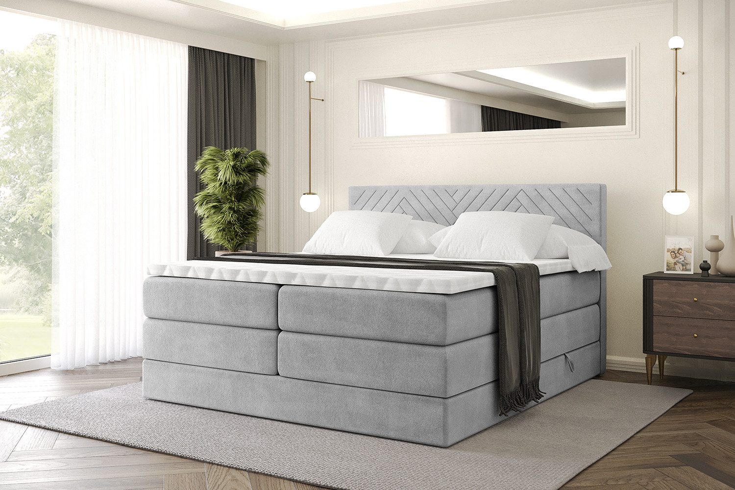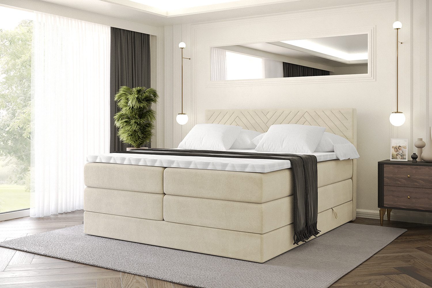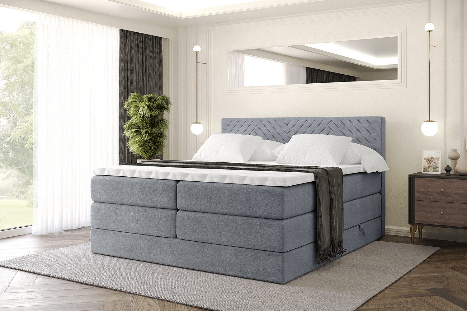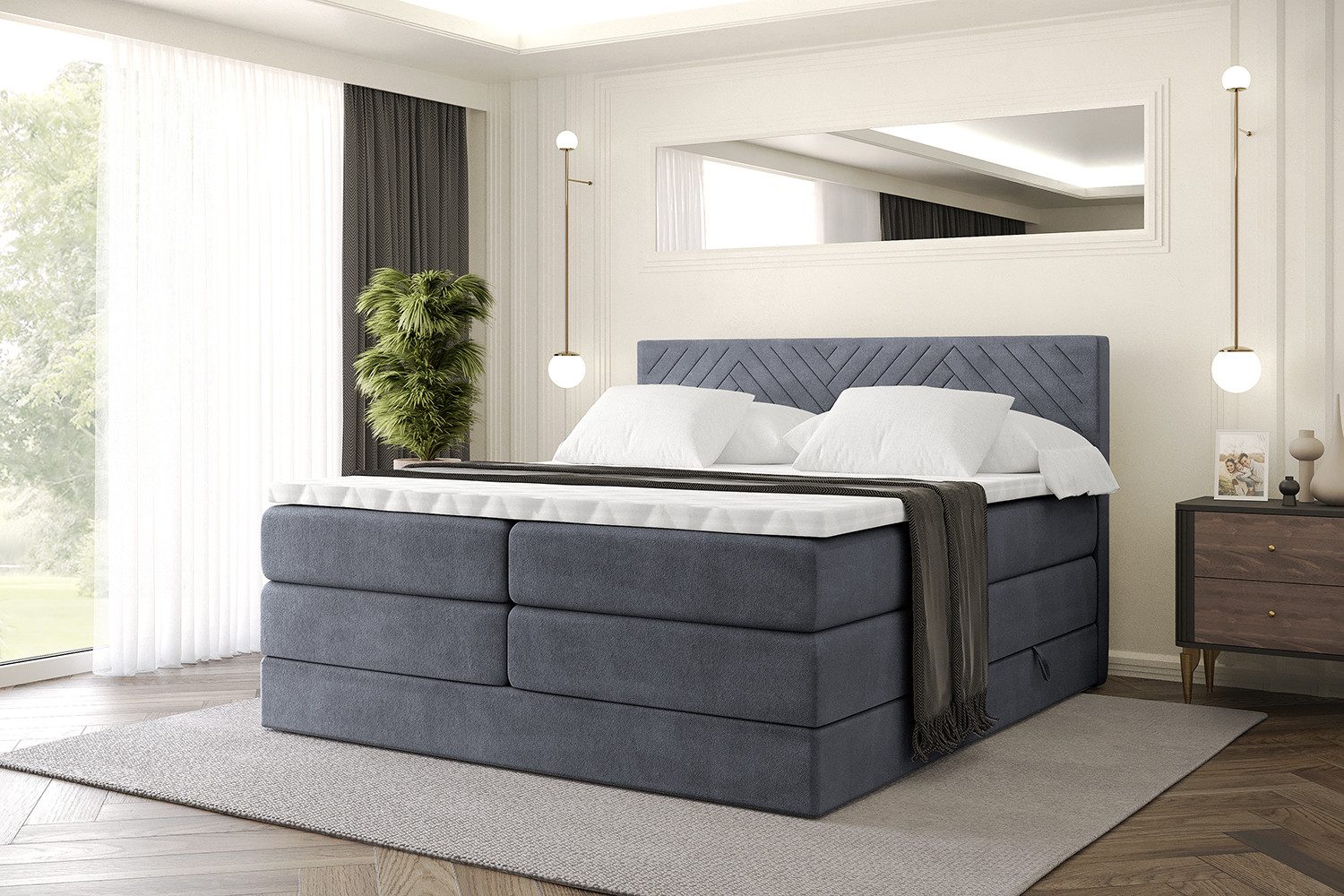 Das Bett istmit zwei Bettkästen ausgestattet, die viel Platz für Bettwäsche und Kissen bieten und für ein aufgeräumtes Schlafzimmer sorgen.