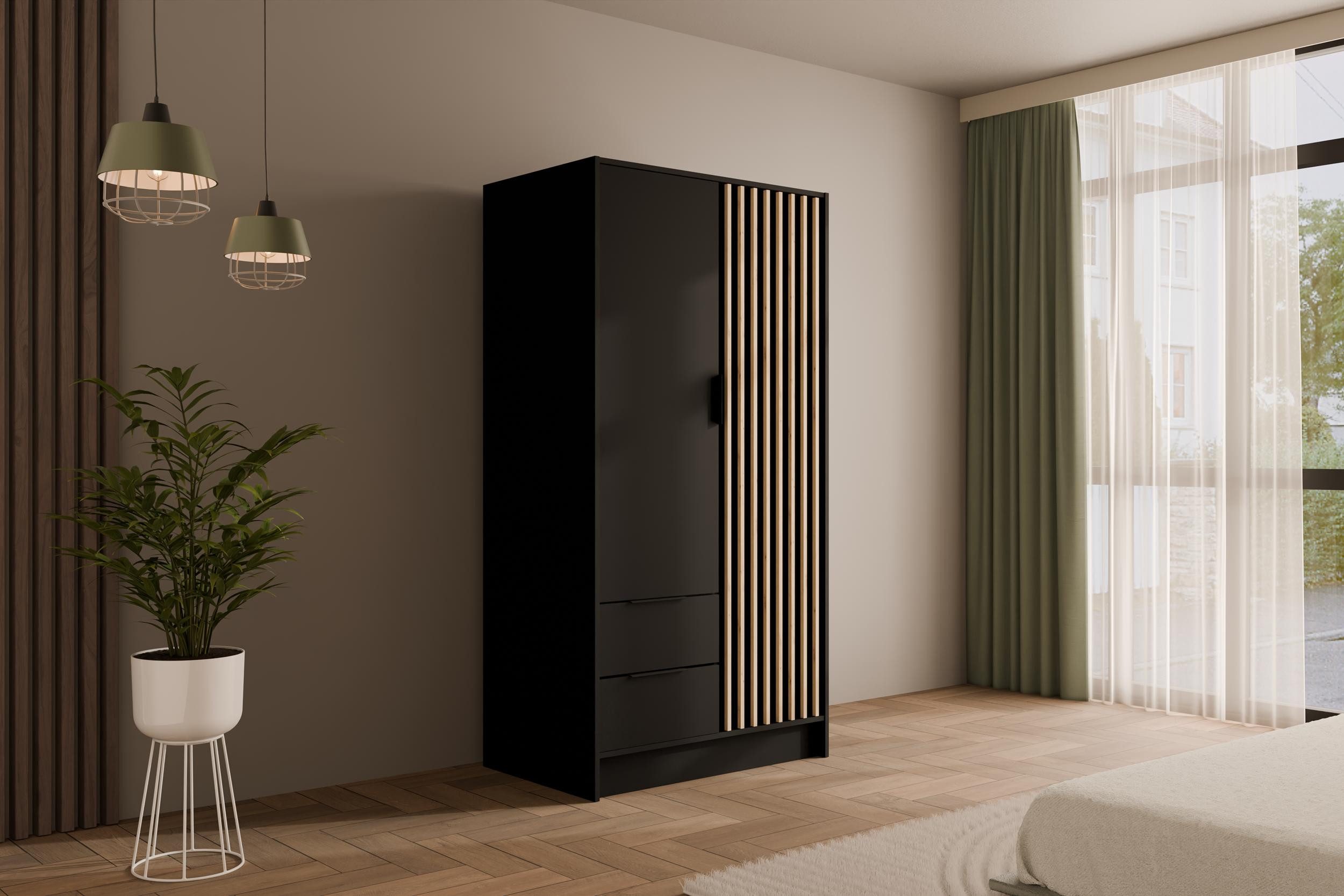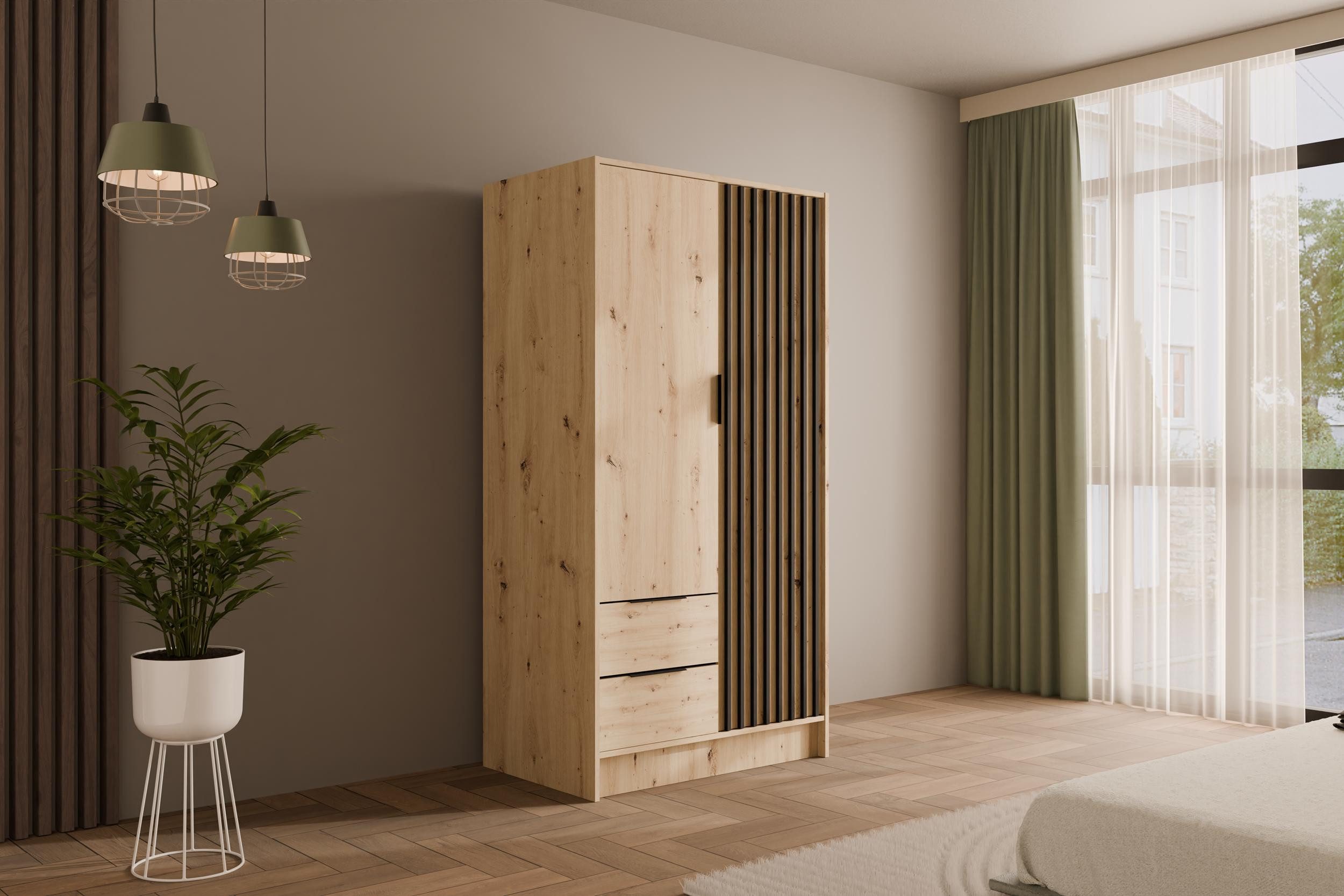 Der Kleiderschrank mit leise schließenden Flügeltüren und Selbstschließmechanik fügt sich hervorragend in die Inneneinrichtung eines Schlafzimmers ein.