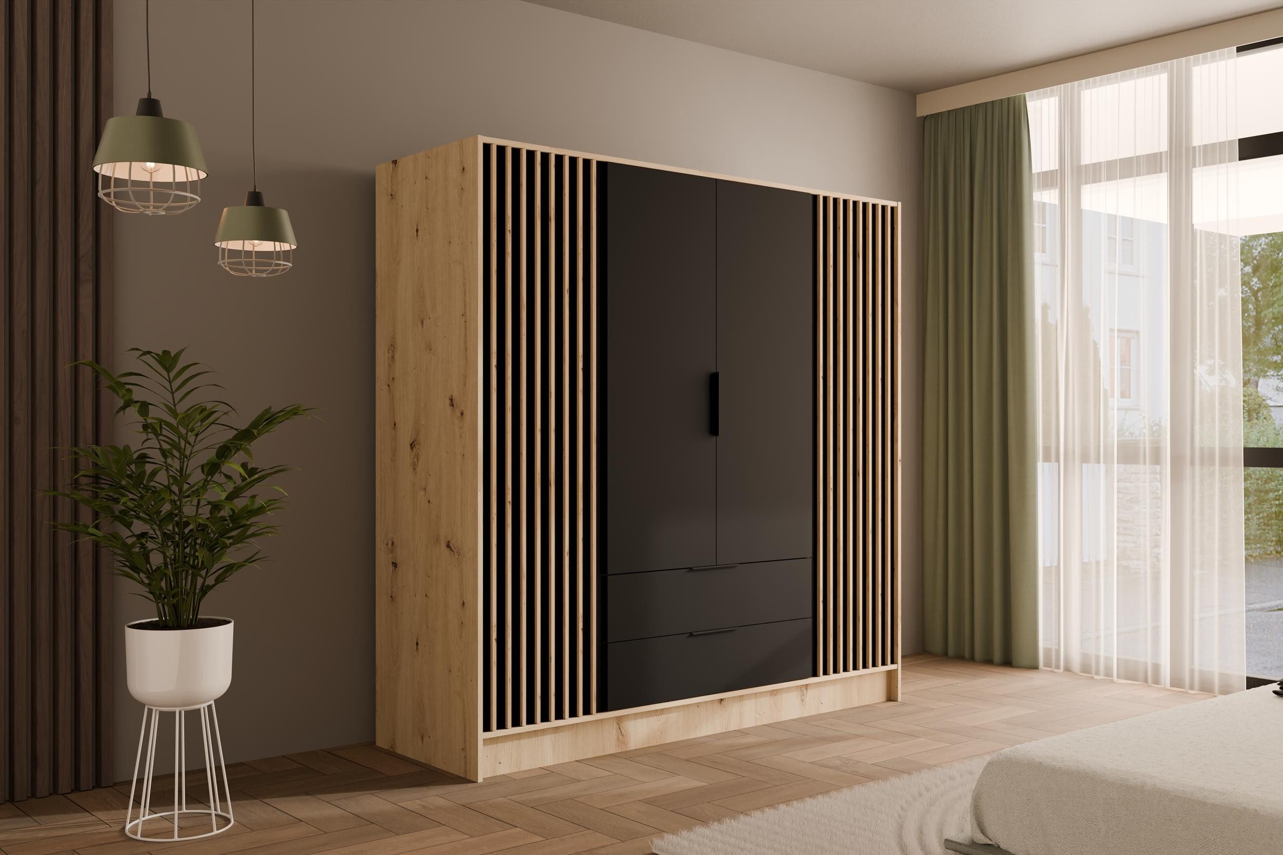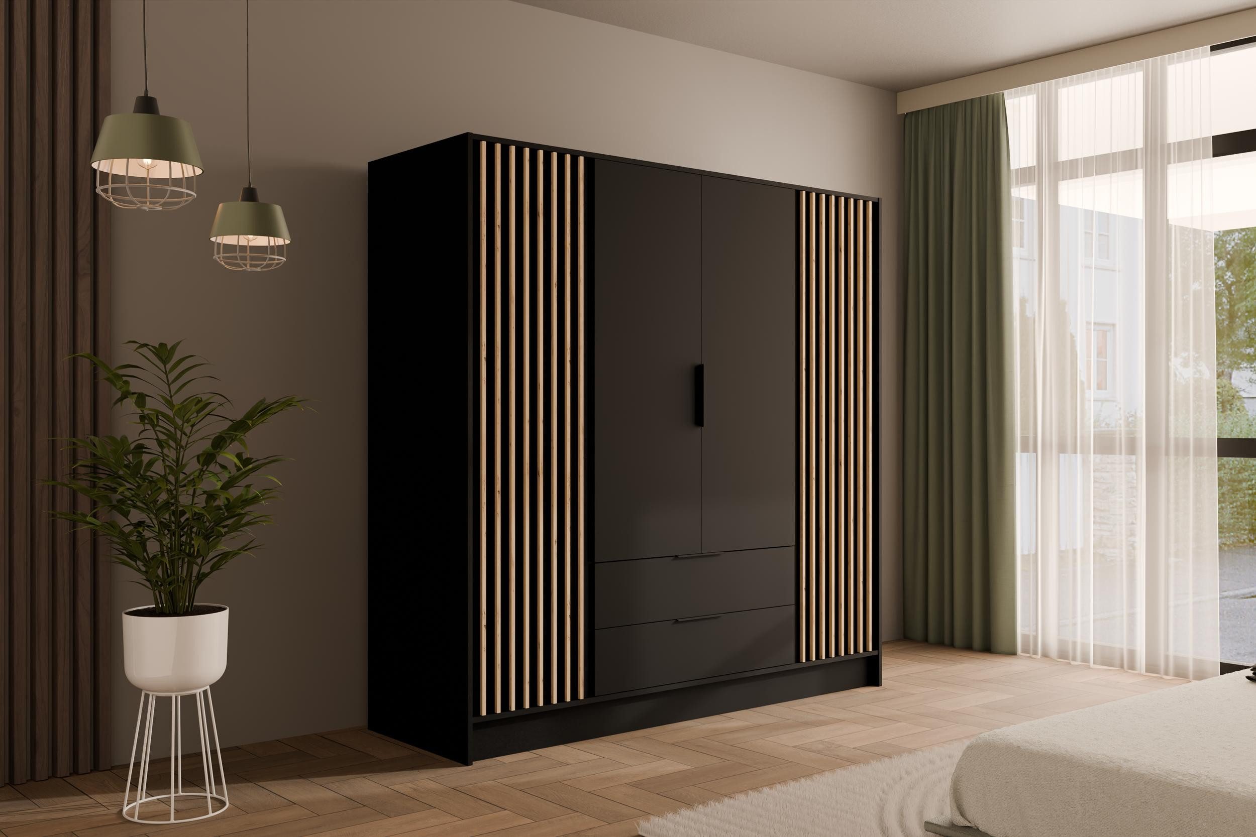 Der Kleiderschrank mit leise schließenden Flügeltüren und Selbstschließmechanik fügt sich hervorragend in die Inneneinrichtung eines Schlafzimmers ein.