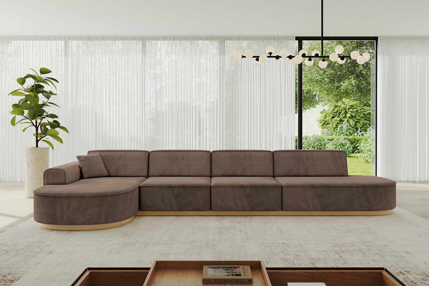 Die eleganten Holzbasis verleihen der rückenechten Polstercouch eine gewisse, optische Leichtigkeit und runden das Gesamtbild gekonnt ab.