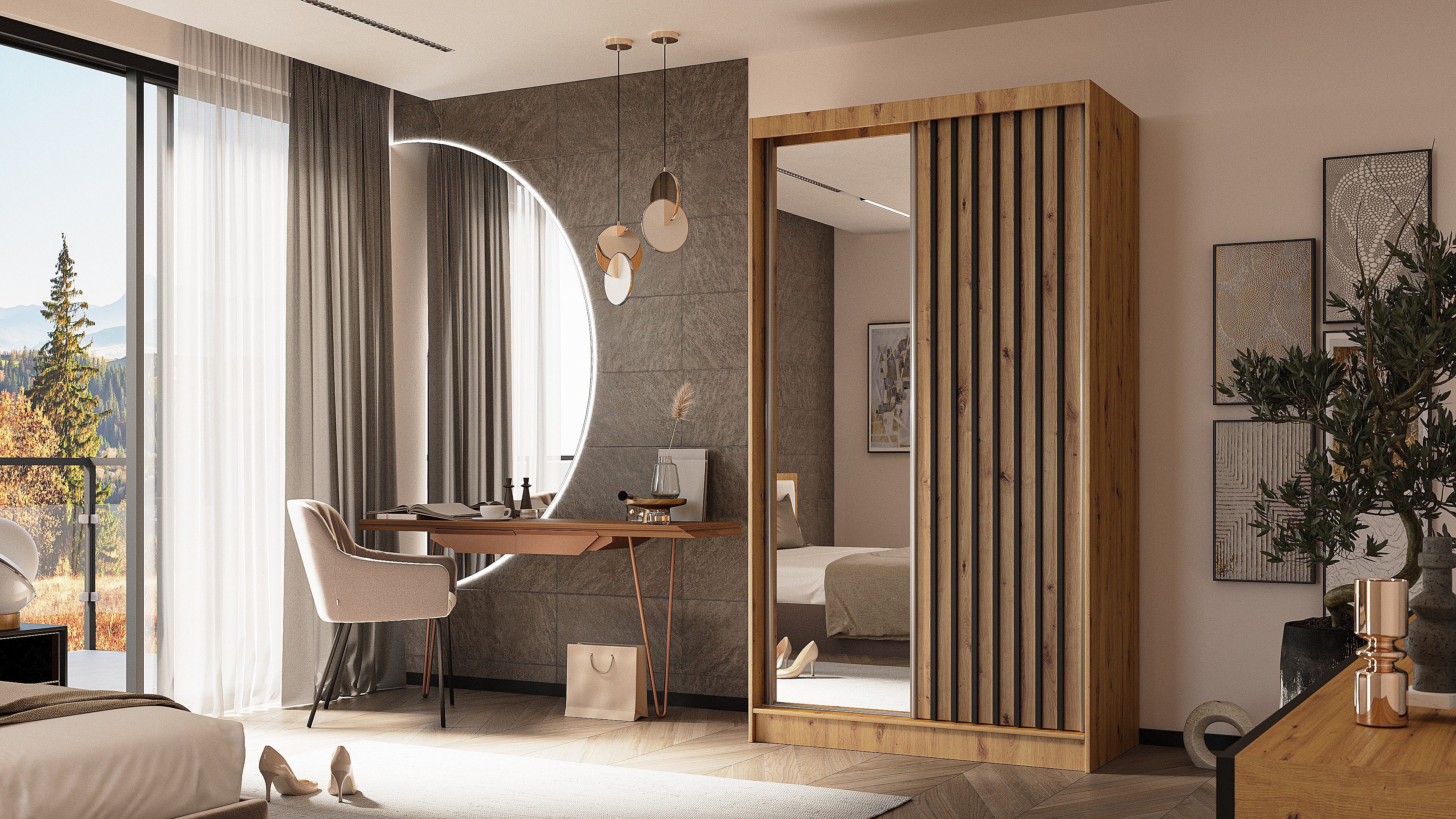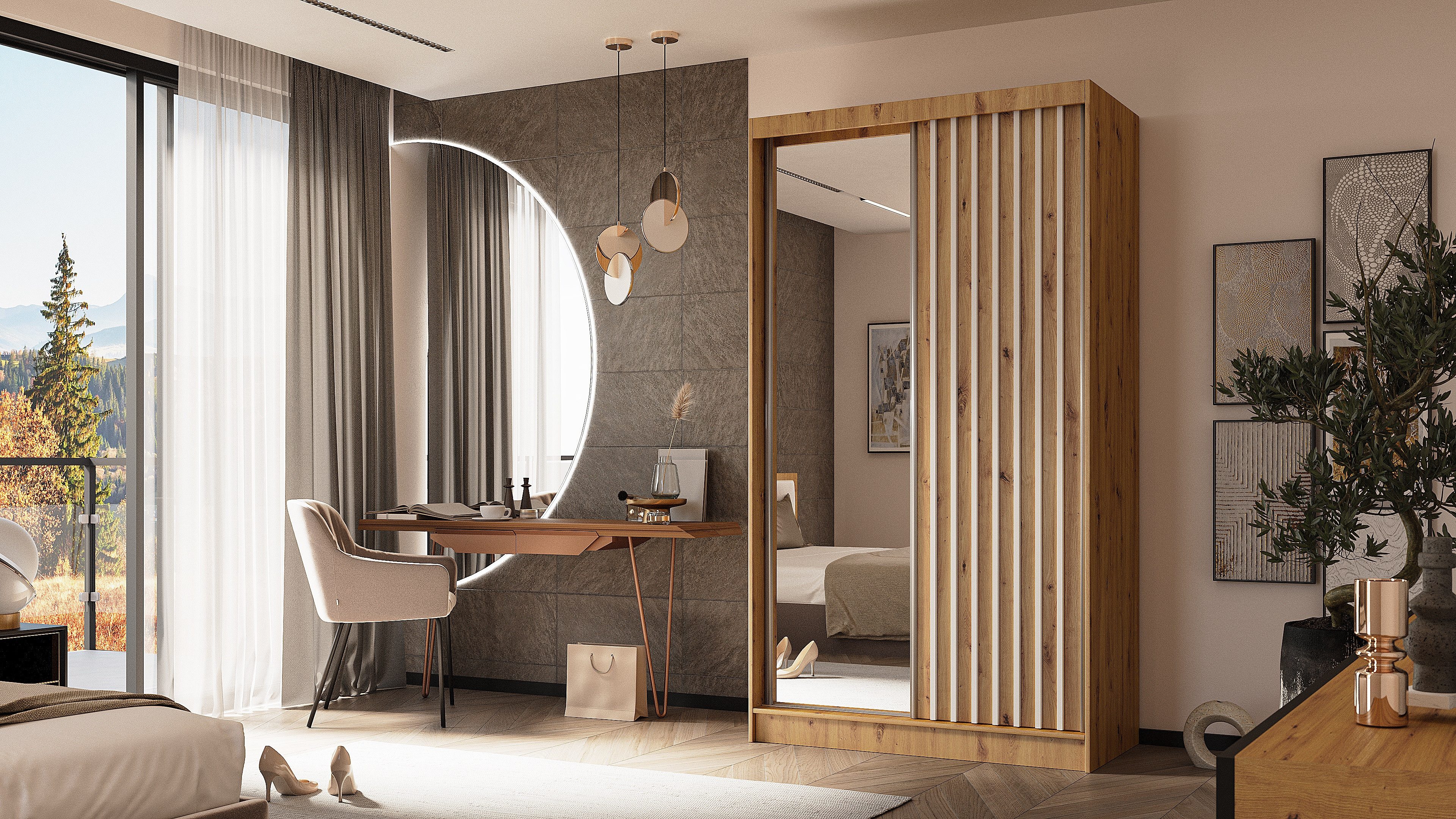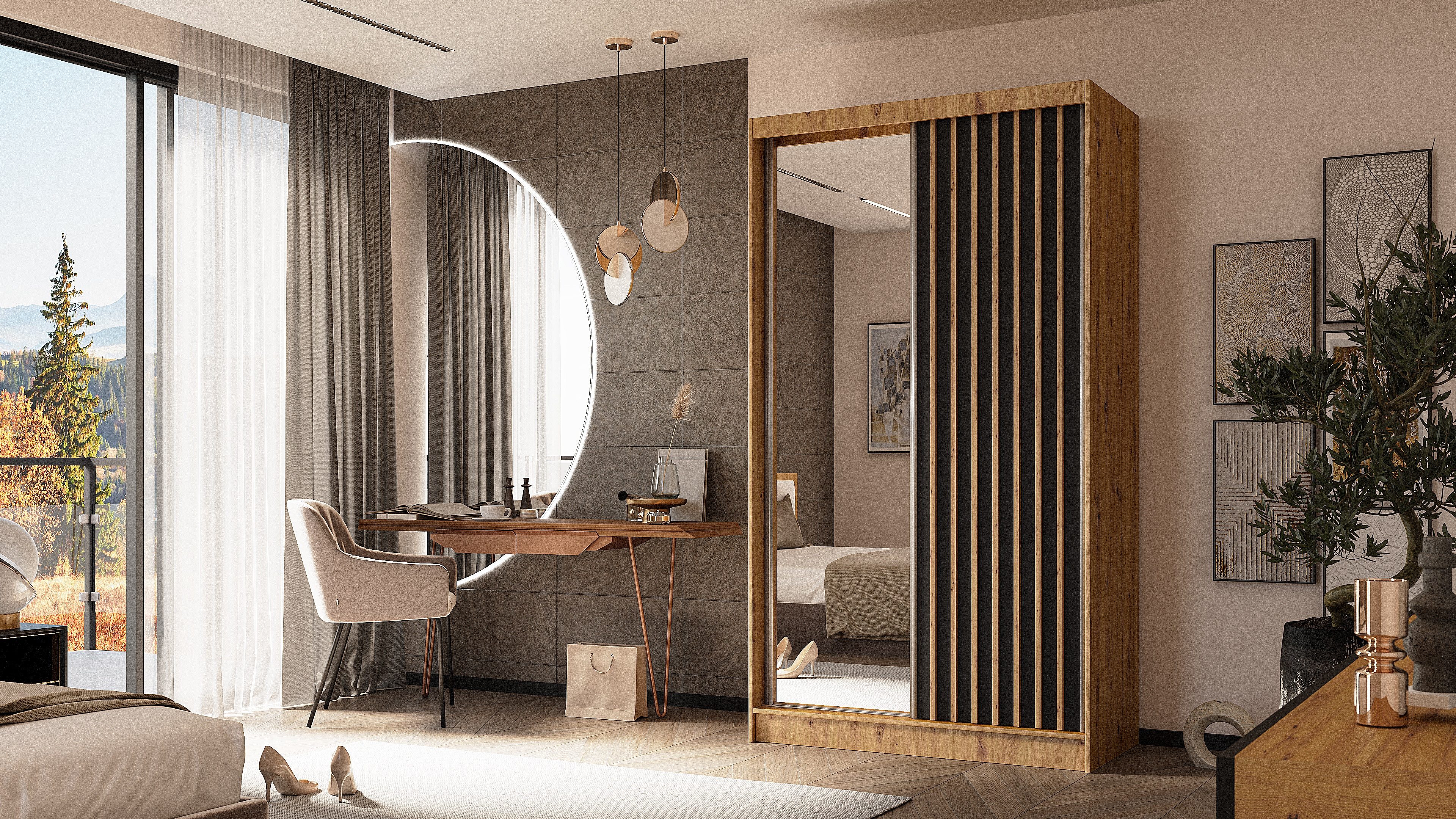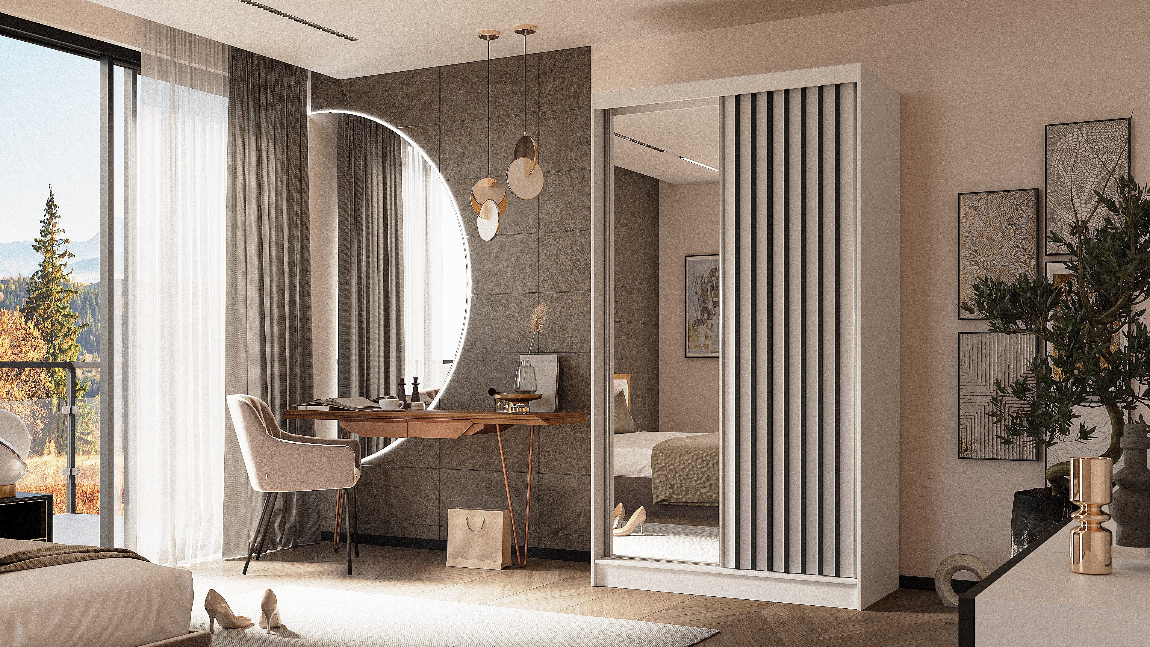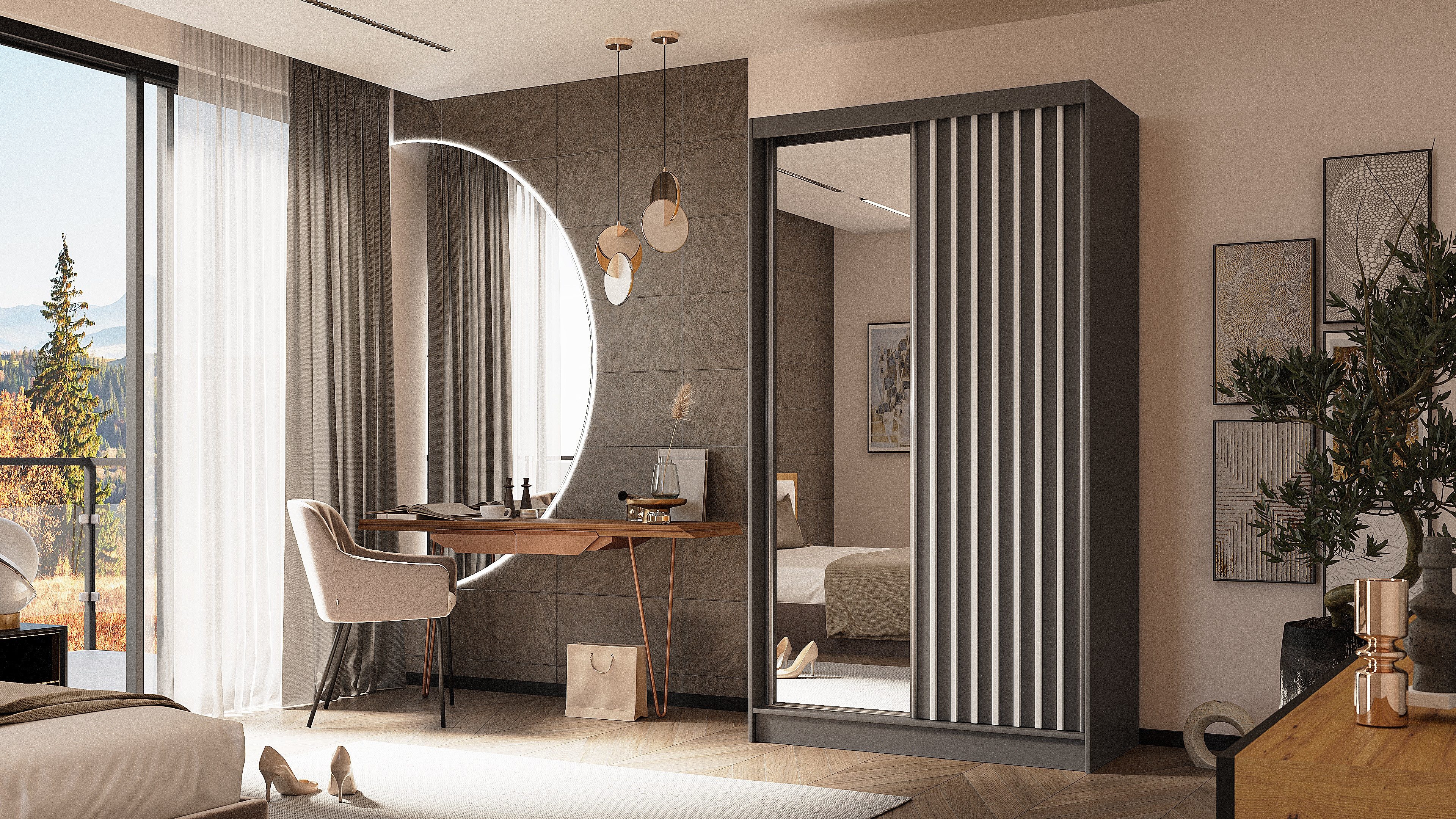 Die verspiegelten Fronten vergrößern visuell das Zimmer und verleihen dem Schrank eine optische Leichtigkeit.