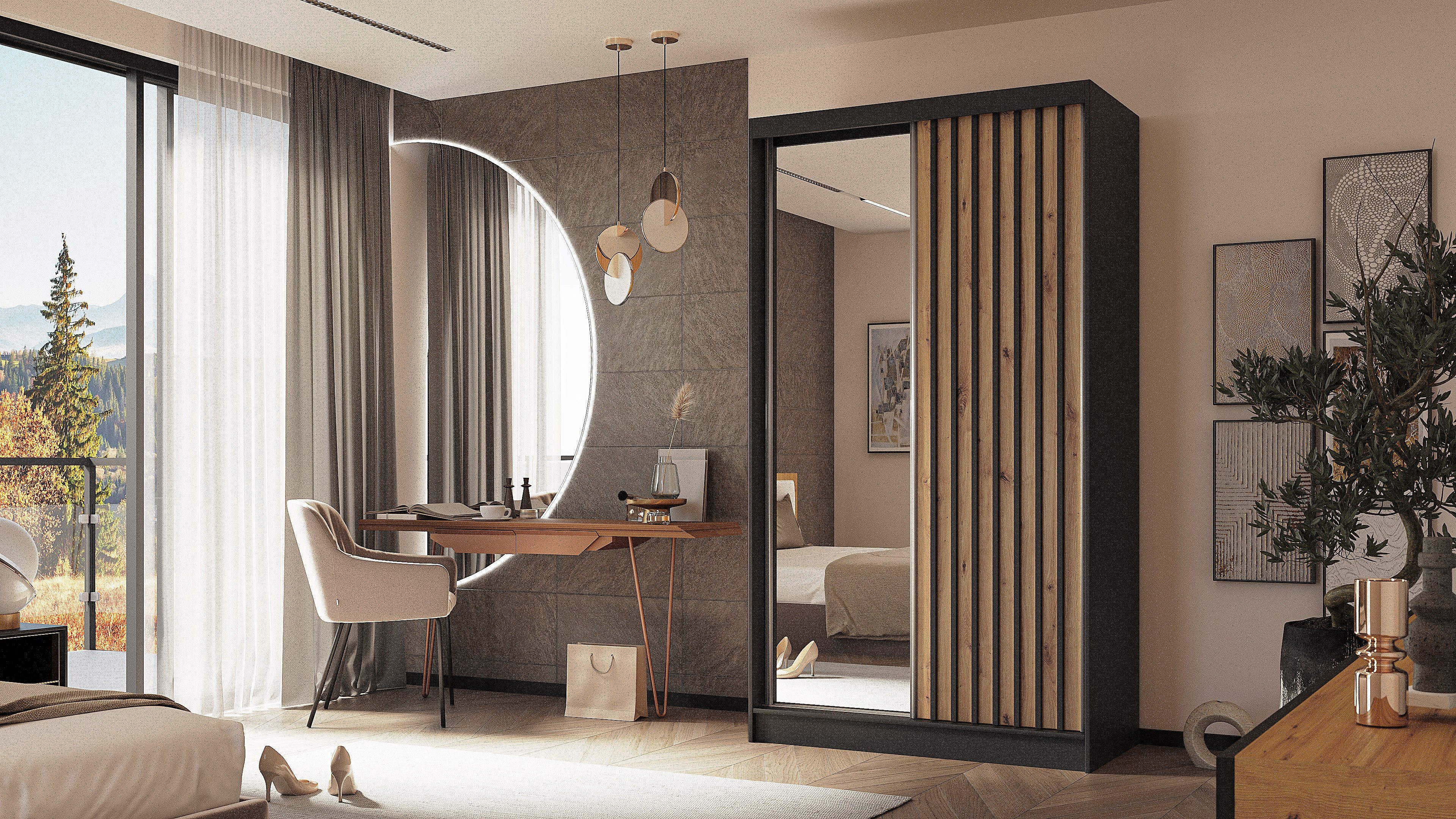 Der Kleiderschrank mit Schiebetüren und Spiegel fügt sich hervorragend in die Inneneinrichtung eines Schlafzimmers ein.