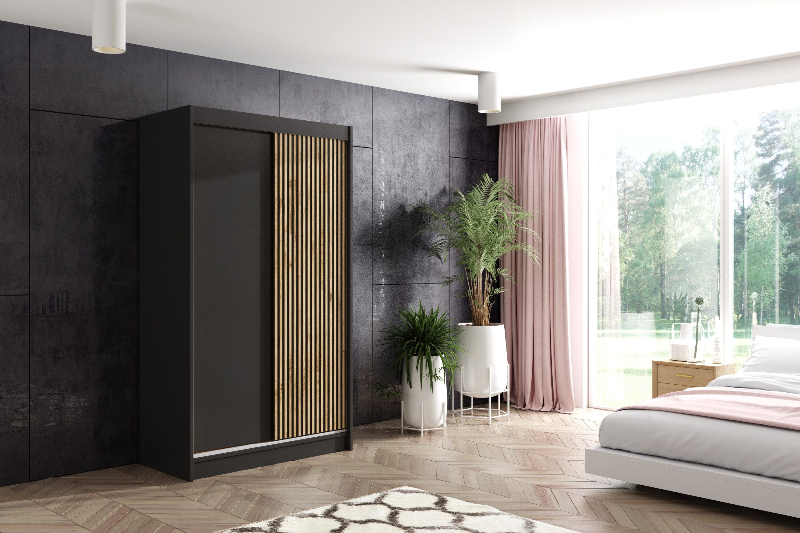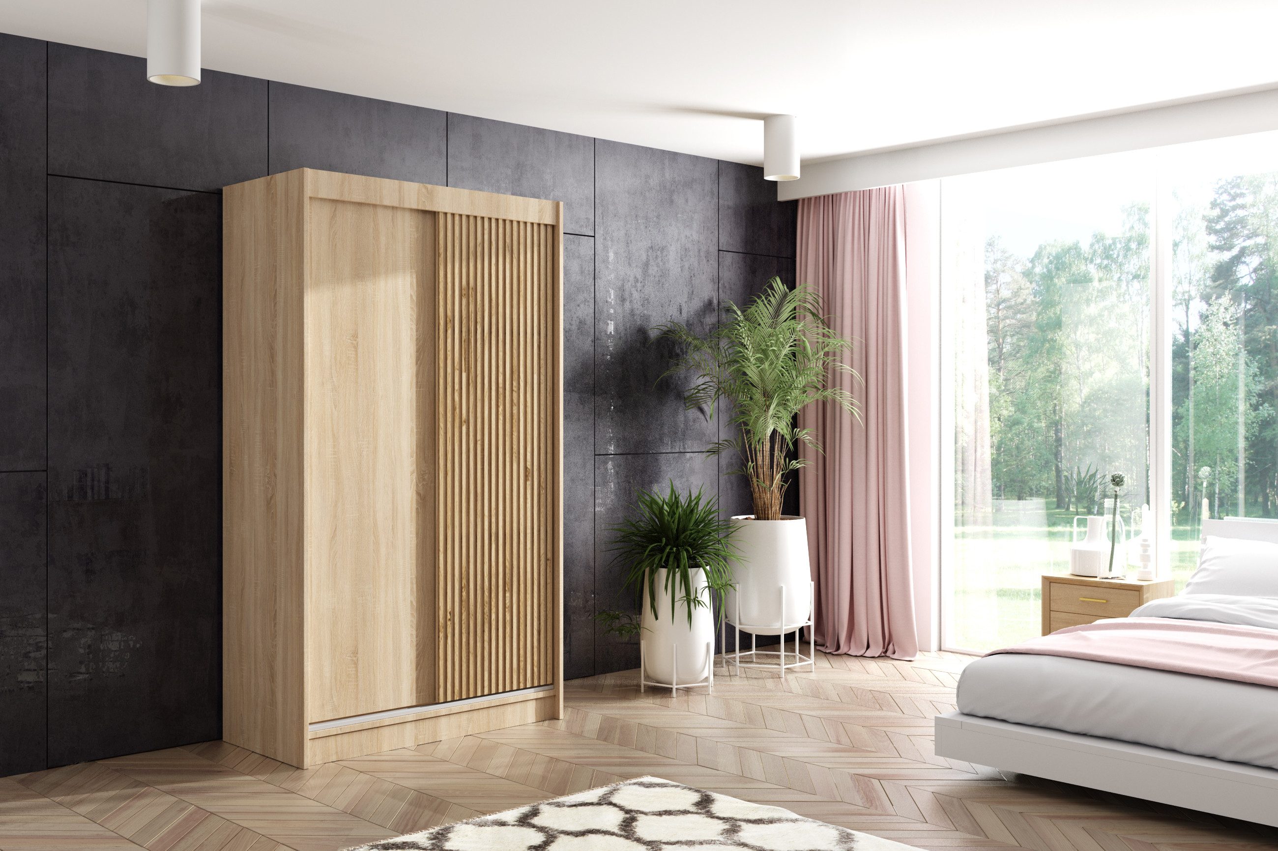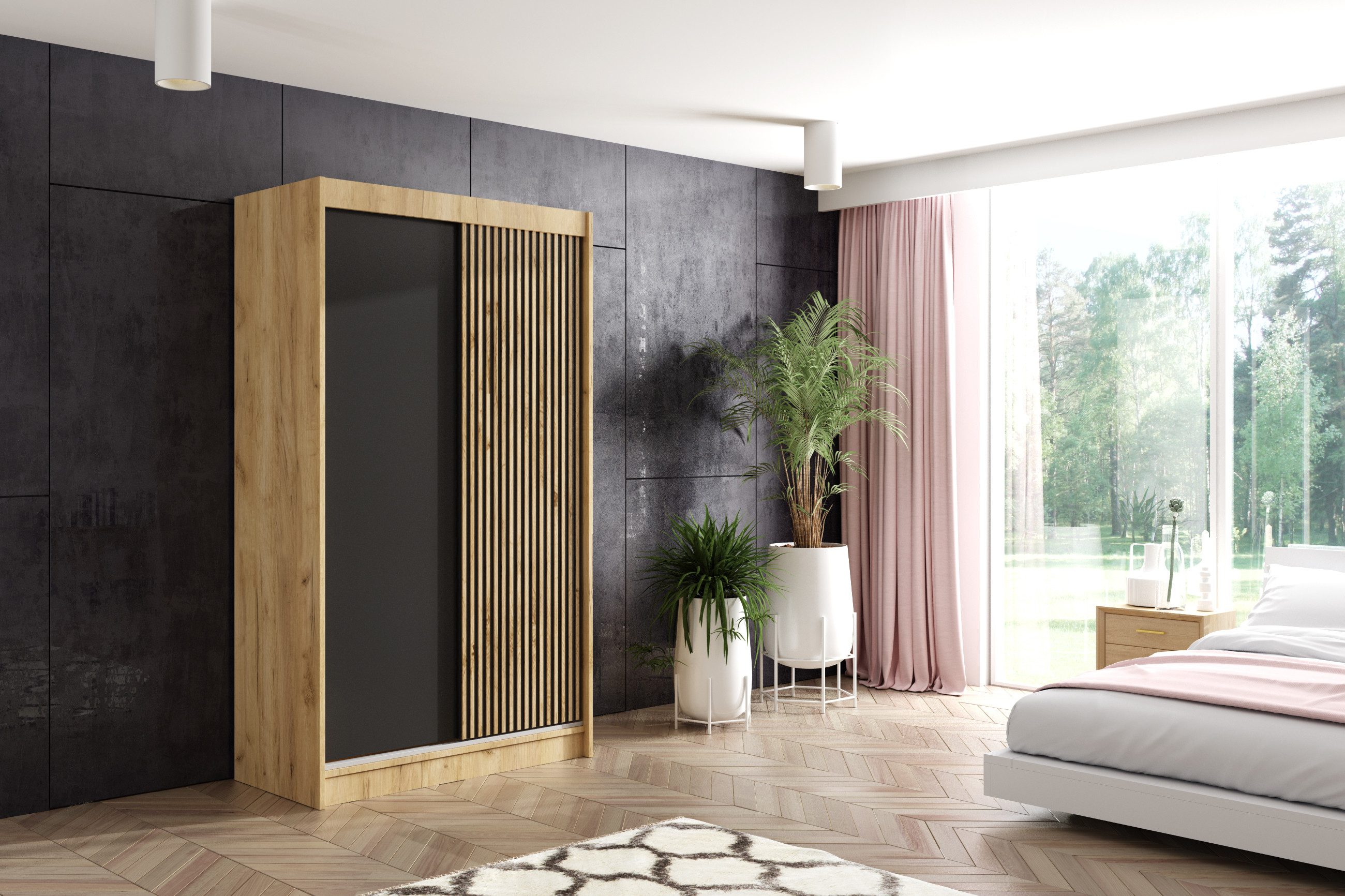 Der Kleiderschrank mit Schiebetüren und Lamel-Fronten ist ein Möbelstück in moderner Aufführung, das sich in die Inneneinrichtung eines Schlafzimmers perfekt einfügt.