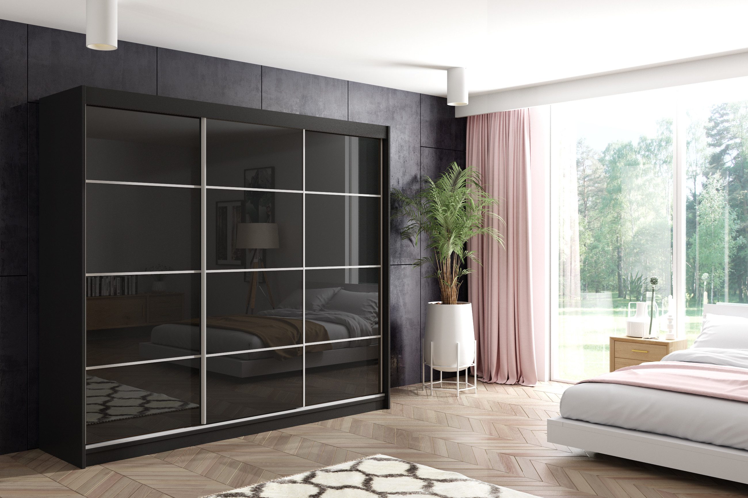 Der Kleiderschrank mit Schiebetüren und Lacobel-Fronten ist ein Möbelstück in moderner Aufführung, das sich in die Inneneinrichtung eines Schlafzimmers perfekt einfügt.