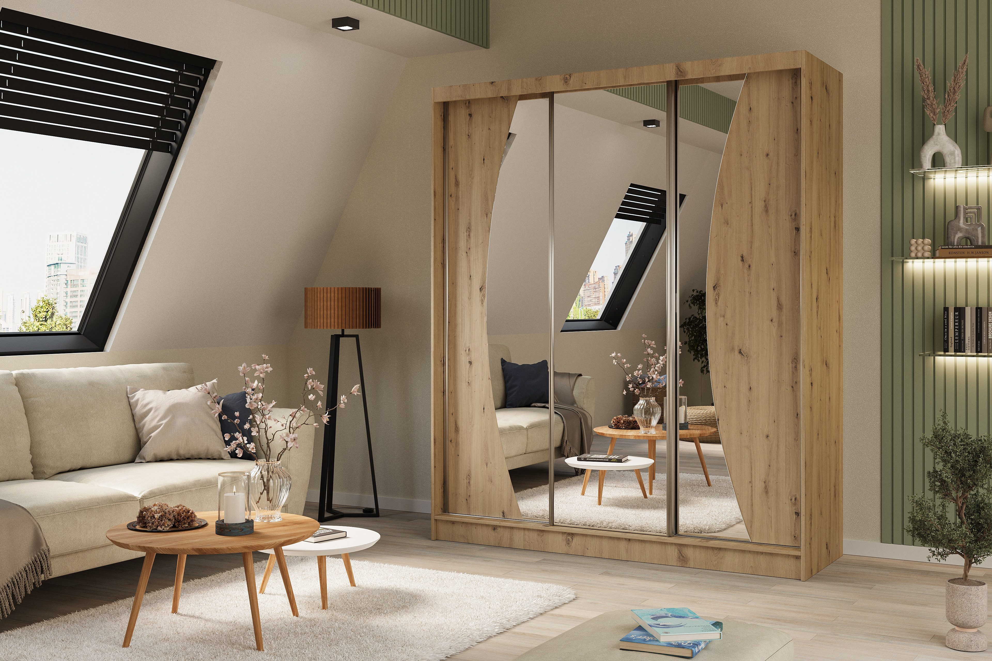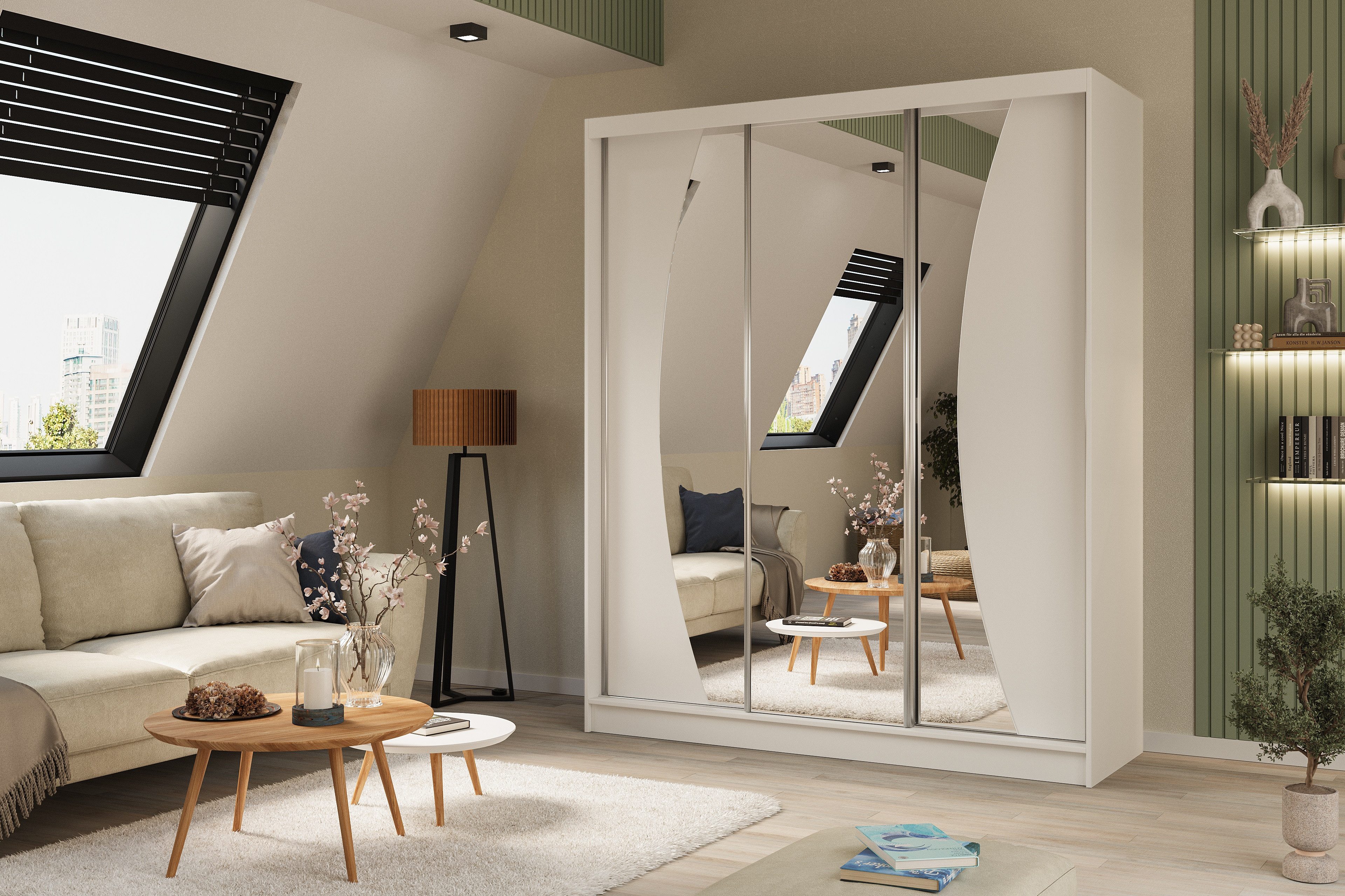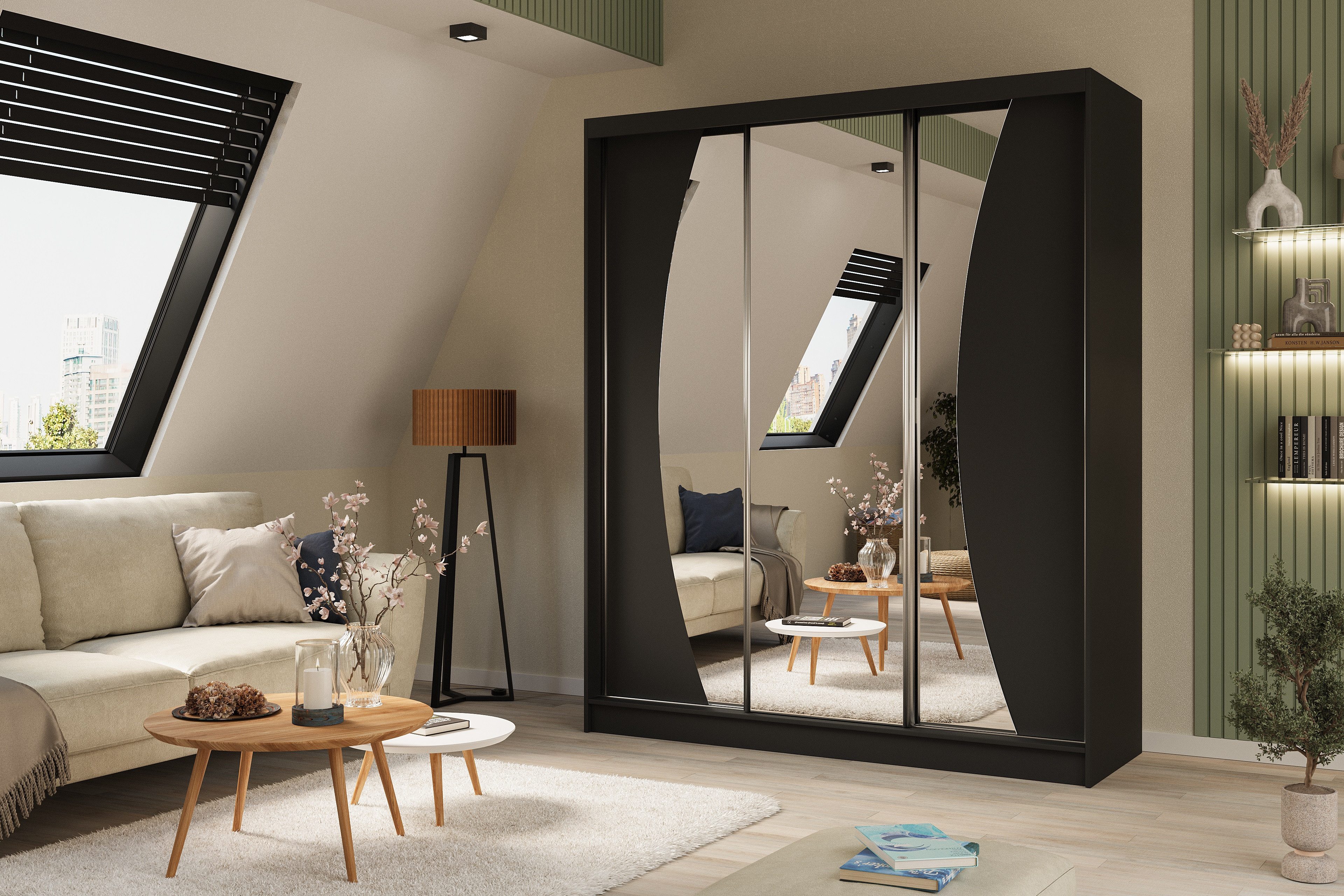 Die verspiegelten Fronten vergrößern visuell das Zimmer und verleihen dem Schrank eine optische Leichtigkeit.