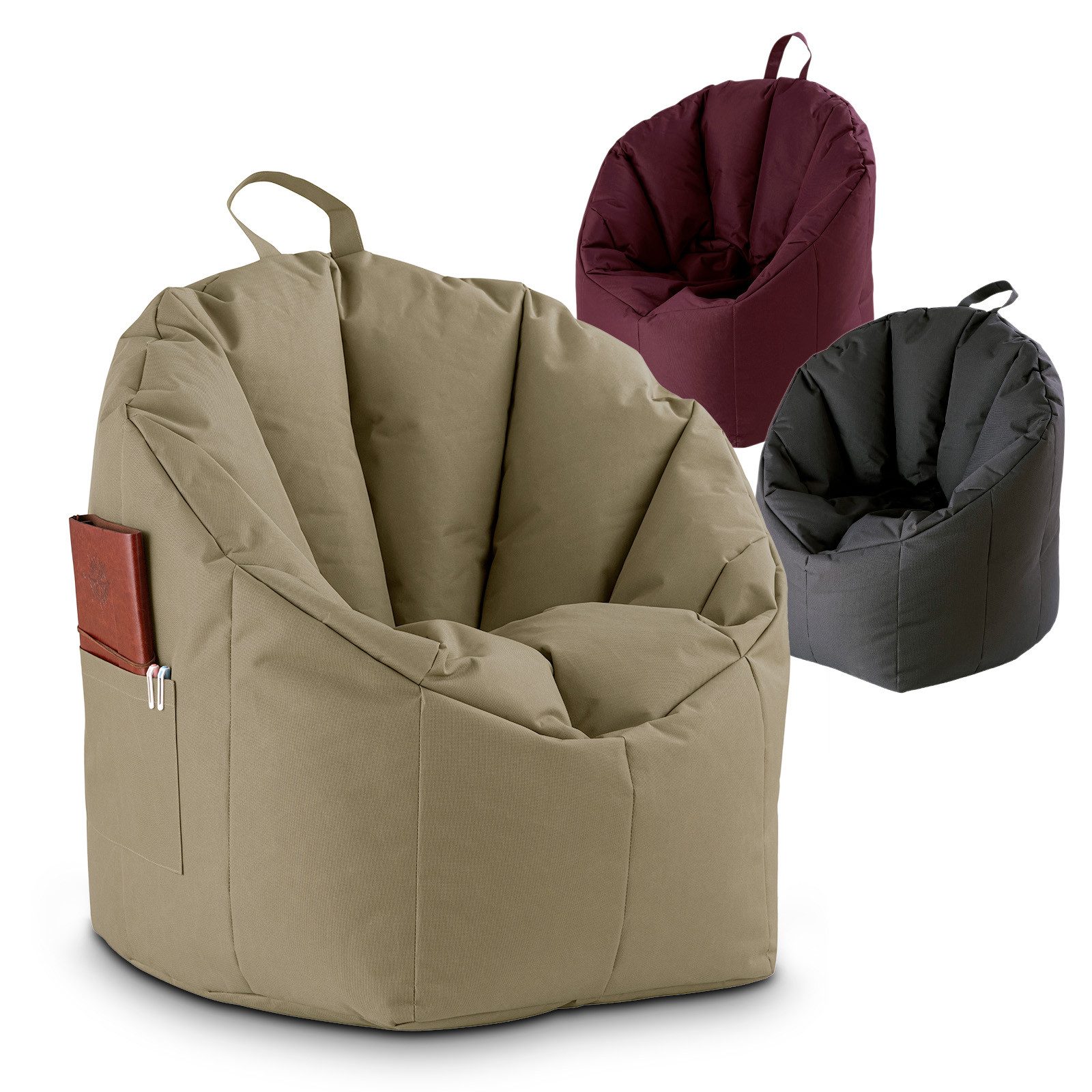 Die Sitzsessel sind moderne, trendige Sitzmöbel, die mit einem robusten formstabilen wasserfestem Bezug aus 100 % Nylon für den Innen- und Außenbereich hergestellt werden. Trotzdem sollten Sie nicht direkt im Regen stehen! Das Material aus dem der Bezug des Big Bamba besteht ist nicht nur reißfest und schmutzabweisend, sondern ist darüber hinaus auch wasserfest und farbecht. Nylonfasern sind außergewöhnlich stark und elastisch und haben eine ausgezeichnete Zähigkeit, Abriebfestigkeit und sind leicht zu waschen. Dieses elastische und sehr robuste Gewebe ist lange haltbar, reißfest, atmungsaktiv sowie knitterarm und weist eine leichte Struktur auf. Die Füllung besteht aus ultraleichten Styroporkügelchen, die trotz ihrer Leichtigkeit einen festen und sicheren Stand gewährleisten. Die flexible Füllung passt sich jeder Körperhaltung ergonomisch an und man kann ohne Druckstellen entspannt darauf relaxen. Die Sitzsäcke haben einen Durchmesser von ca. 60 cm und sind mit einer nachfüllbaren Nylonhülle ausgestattet. Die Steppungen im Rücken der Gartensessel sorgen für langlebige Form und Stabilität. Unsere Outdoor-Sitzsäcke sind sehr bequem, ultra modern und kommen in 3 angesagten kräftigen Farben daher. Farblich passende Sitz- und Fußhocker finden Sie unter der Artikelnummer CAS007005 in unserem Меню. Dank ihrer Leichtigkeit können die Relaxsessel an jeden Ort transportiert und aufgestellt werden. Ein Outdoor-Sitzsack ist ein vielseitig einsetzbares stylisches Relaxmöbel. Höchste Qualität in Material und Verarbeitung trifft hier, dank Direktimport, auf günstigsten Preis.