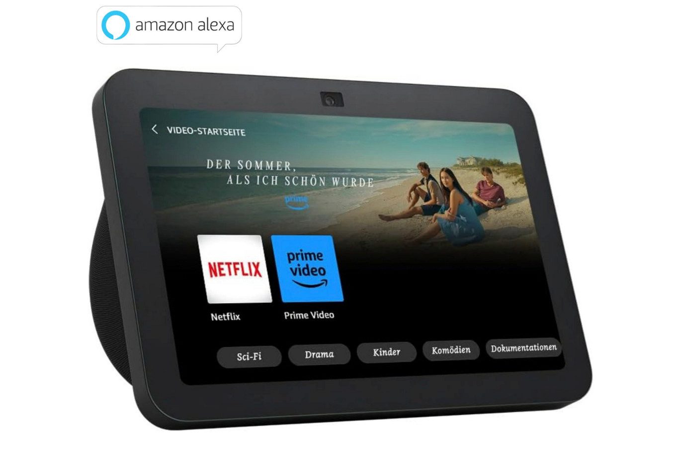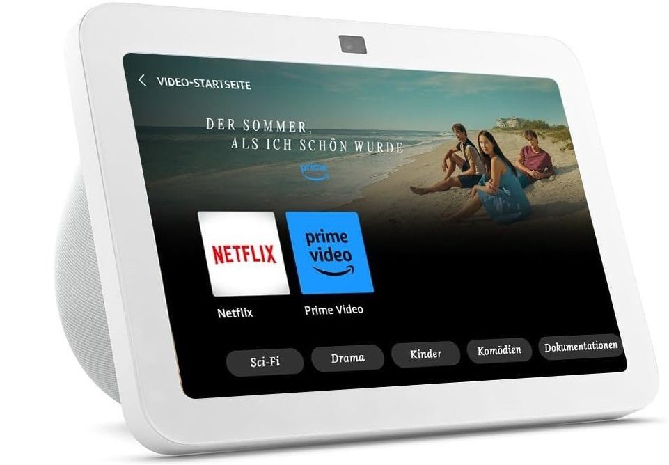 Erlebe deine Lieblingsinhalte auf dem 8-Zoll-HD-Touchscreen mit beeindruckendem 3D-Audio. Prime Video, Netflix und Amazon Music kommen mit satter Klangqualität und lebendigen Bildern direkt zu dir nach Hause. Perfekt für Musik, Serien und Filme (Abonnements für bestimmte Dienste erforderlich).
