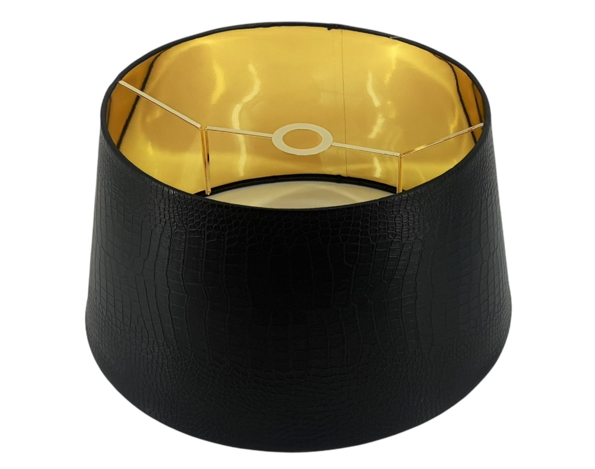 Exklusiver Lampenschirm in der Farbe Schwarz mit Kaiman Leder Imitation. Formschönes Design, zeitlose Ästhetik und exklusive Optik. Der Lampenschirm harmoniert mit vielen Einrichtungsstilen und ist für Tisch- oder Stehleuchten geeignet. Der Schirm blendet den Betrachter nicht. Der Lichtaustritt erfolgt kegelförmig nach unten und oben und verbreitet einen warmen Glanz. Richtiges Licht ist das Maß aller Dinge für ein angenehmes Wohnambiente. Produktmerkmale im Überblick : Hochwertige Verarbeitung Verdrahtung : Gold Form : Konisch / nach oben verjüngend Farbe : Schwarz Lampenfassung : E27 < b>Material : Aussen : Kunstledern Caiman Croco Imitat Innen : Gold Folie kaschiert. Maße: 25*40*26cm