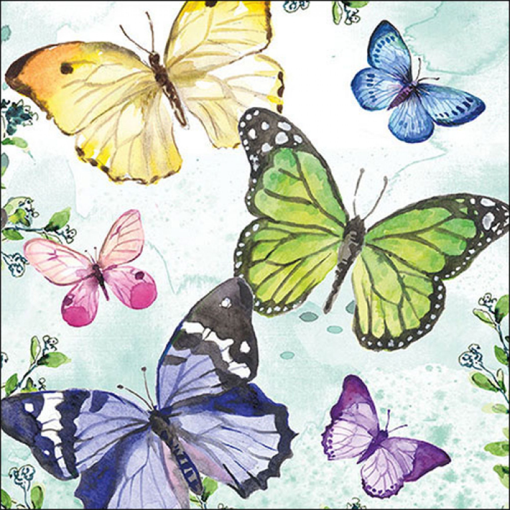 PRODUKT: Einweg Papierservietten mit Schmetterlinge & Aquarell Motiv / MATERIAL: Tissue - Papier, FSC zertifiziert / GRÖSSE: ca. 33 x 33 cm (entfaltet) bzw. 16,5 x 16,5 cm
