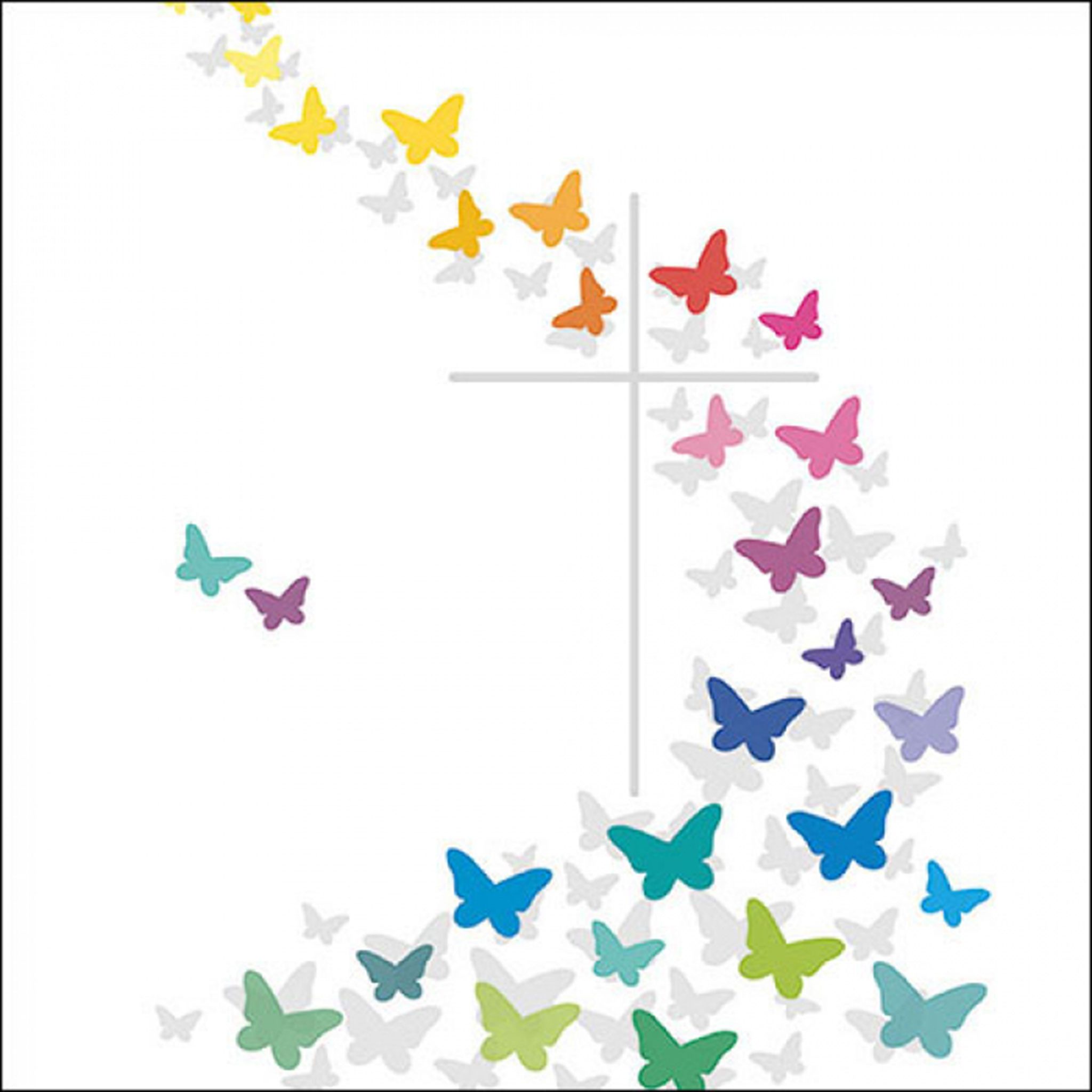 PRODUKT: Einweg Papierservietten mit Schmetterlingen & Kreuz Motiv / MATERIAL: Tissue - Papier, FSC zertifiziert / GRÖSSE: ca. 33 x 33 cm (entfaltet) bzw. 16,5 x 16,5 cm (gefaltet)