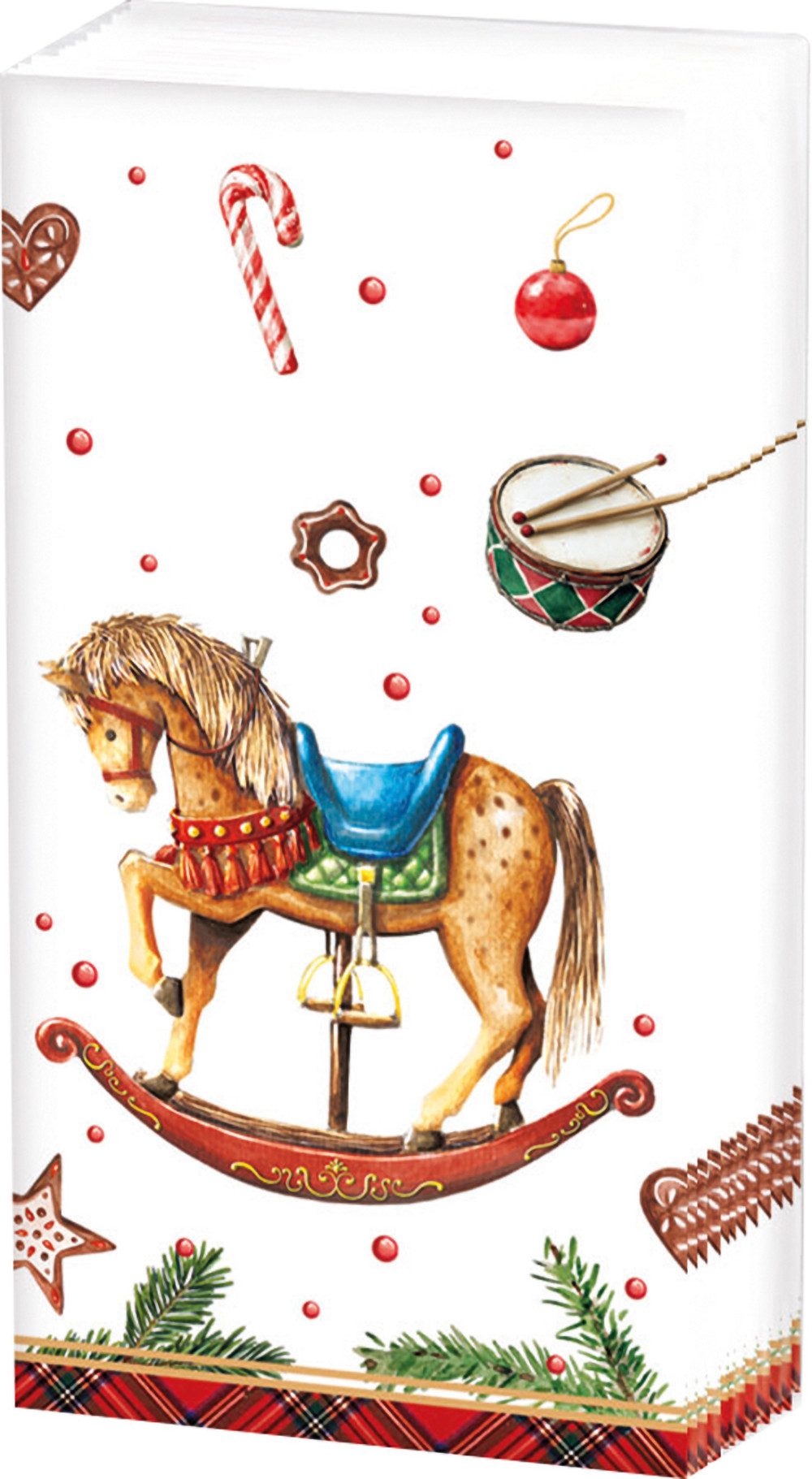 Die Papiertaschentücher 'Classic Rocking Horse' bringen mit ihrem charmanten Schaukelpferd-Motiv weihnachtliche Stimmung in dein Zuhause. Mit einer Размер von 21 x 21 cm sind sie perfekt für kreative Projekte. Durch die Serviettentechnik kannst du dieses zauberhafte Motiv auf zahlreiche Oberflächen übertragen. Ob Möbel oder Schubladen – deiner Fantasie sind keine Grenzen gesetzt. Mit dem passenden Kleber und einem schützenden Lack verleihst du deinen Objekten ein individuelles und festliches Aussehen. Lass dich von der nostalgischen Anmutung des Schaukelpferds inspirieren und erschaffe einzigartige Dekorationen, die dein Zuhause in eine festliche Oase verwandeln.