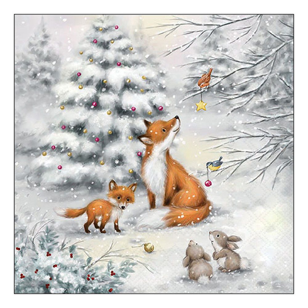 Erlebe die zauberhafte Winterwelt mit der Serviette 'Waldtiere im Winterwald'. Die verschneite Weihnachtsszene mit einer Fuchsmama und ihrem Jungen sowie zwei Hasen wird dich verzaubern. Dank der einseitigen Bedruckung und der Rückseite in Weiß, kannst du die Serviette mit der Serviettentechnik auf zahlreiche Untergründe wie Holz, Pappe, Karton, Stoff und vieles mehr übertragen. Gestalte damit zum Beispiel tolle Deko-Objekte oder auch Geschirr. Die Serviette hat eine Breite und Длина von je 33 cm und ist somit perfekt für deine kreativen Projekte geeignet. Tauche ein in die winterliche Welt der Waldtiere und gestalte deine eigenen einzigartigen Unikate mit der Serviette 'Waldtiere im Winterwald'.