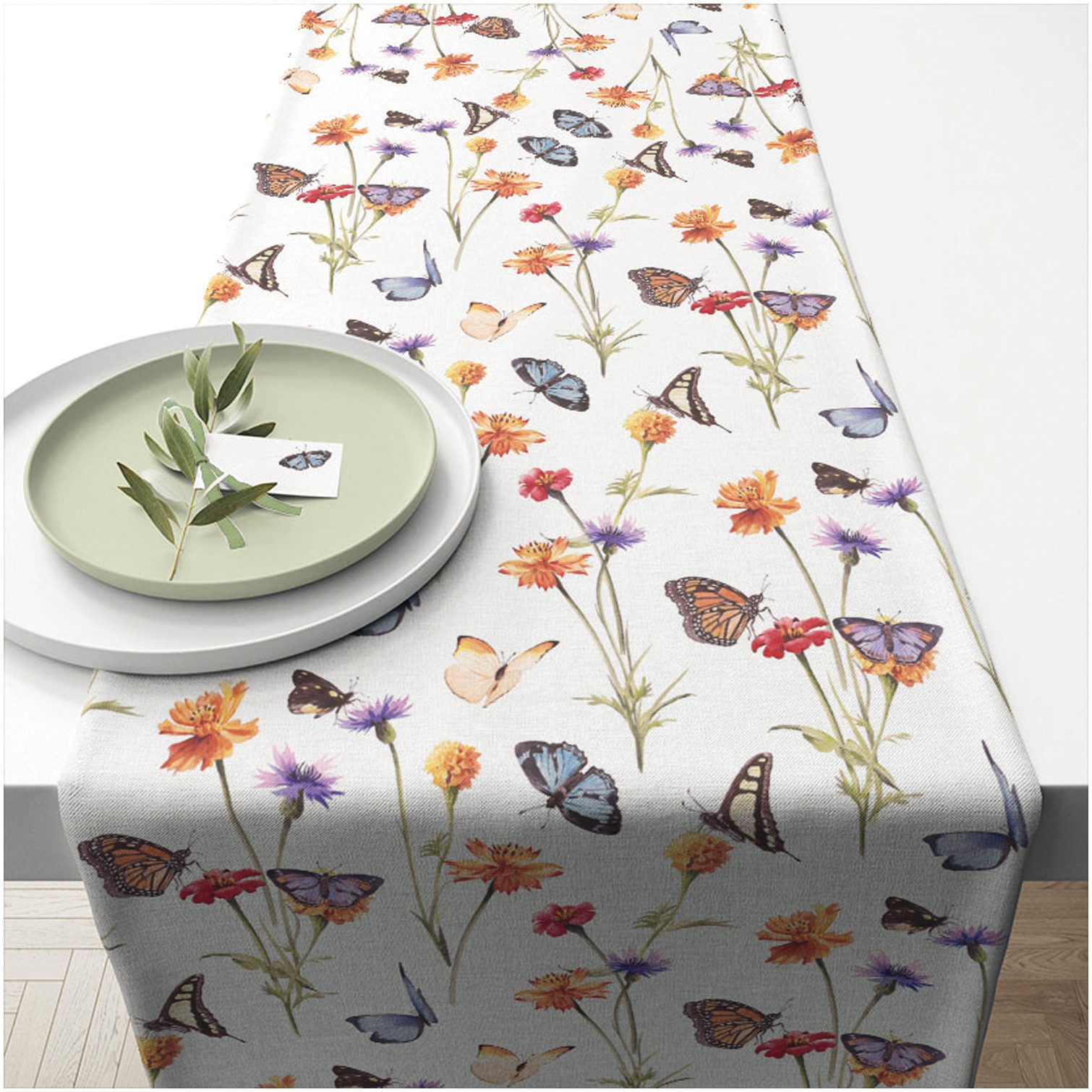 Der Tischläufer besticht durch einen weißen Hintergrund, der von zarten Schmetterlingen und bunten Feldblumen in verschiedenen Rosa- und Lilatönen geschmückt wird. Diese Kombination aus floralen Elementen und lebendigen Farben schafft eine fröhliche und zugleich elegante Atmosphäre. Der Tischläufer bringt die Schönheit der Natur in Ihr Zuhause und sorgt für eine frische, lebendige Atmosphäre auf Ihrem Tisch.