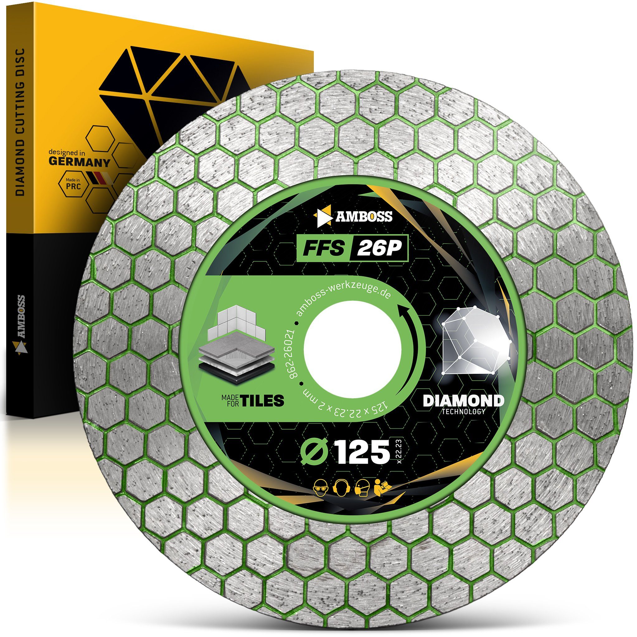 " Trennen, Schleifen und Anfasen mit der Amboss FFS 26P - ihr einzigartiger Aufbau mit Jolly Cut für Gehrungsschnitte und Hexagon-Segmenten für präzisen Feinschliff. Das Multitalent und unverzichtbarer Helfer auf der Baustelle. Geeignet zur Bearbeitung von Feinsteinzeug / Keramikfliesen / Natursteinfliesen / Marmorfliesen / Granitfliesen. * Vorteile: * Trennen und Schleifen mit einer Trennscheibe * Jolly Cut - optimale Gehrungsschnitte in Feinsteinzeug und Keramik * Hexagon Segmente - für präzisen Feinschliff * Technische Beschreibung: * Trennen und direkt Nachschleifen * Segmenthöhe vorne 25 mm * geeignet für Winkelschleifer * Werkstoffe: * Feinsteinzeug * Keramikfliesen * Natursteinfliesen * Marmorfliesen * Granitfliesen ()Diamant Trennscheibe FFS 26P Premium ()"