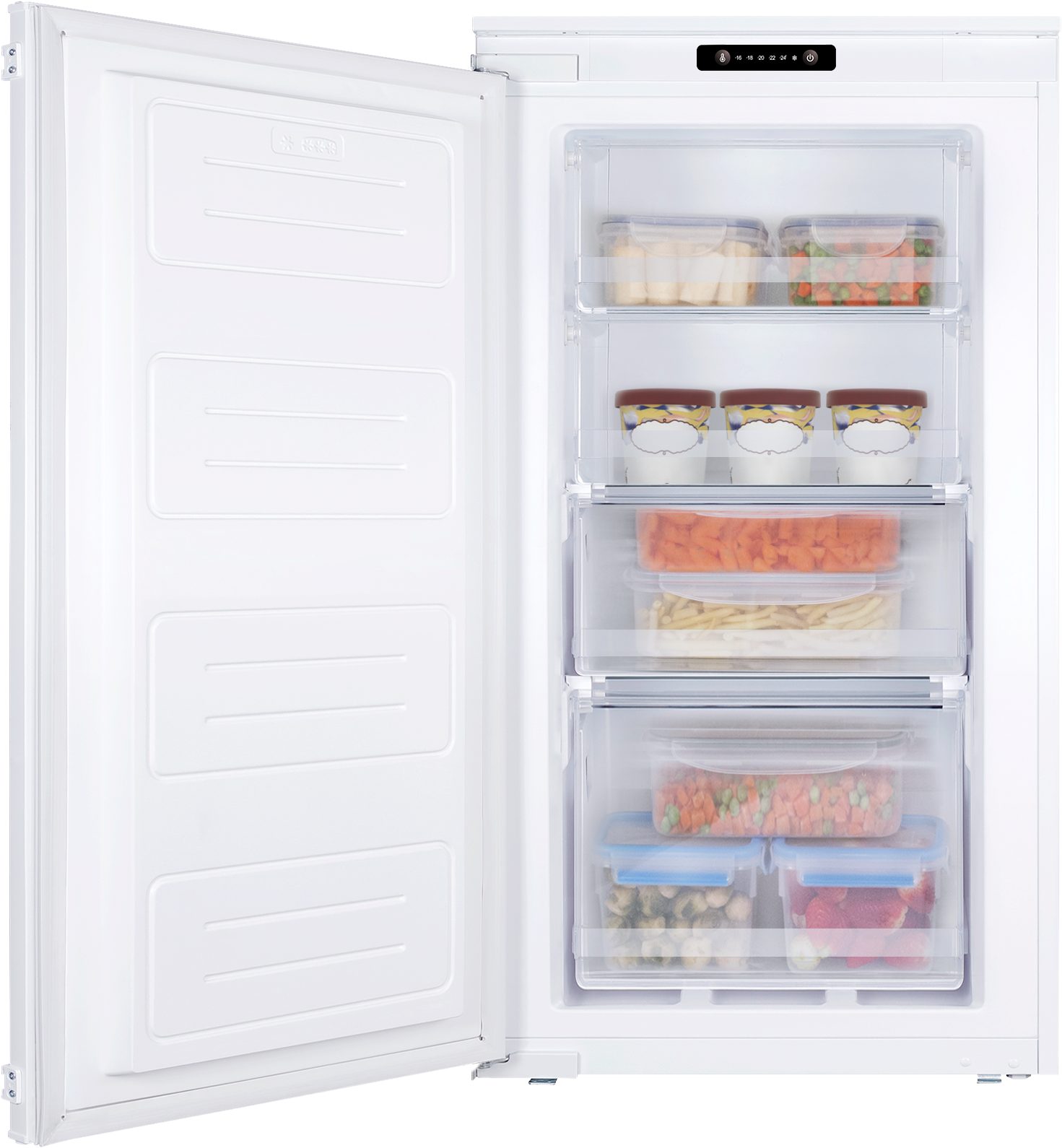 Der Einbaugefrierschrank »EGSS 321 900« von Amica hat eine hohe Funktionalität und ist integrierbar. Das Modell misst 54 x 87,1 x 54 cm (B/H/T). Das Modell arbeitet mit einem Betriebsgeräusch von 38 dB. Es sind vier Gefrierschubladen zum Verstauen des Einkaufs integriert. Die Supergefrier-Funktion sorgt dafür, dass sich die Lebensmittel besonders schnell kühlen und einfrieren lassen. Steht die Tür zu lange offen, gibt der Einbaugefrierschrank ein akustisches Warnsignal. Всеs im Blick hat man außerdem durch die LED-Innenbeleuchtung. Wer auf der Suche ist nach einem Modell, das ausreichend Platz für Lebensmittel bietet, der trifft mit dem »EGSS 321 900« von Amica eine gute Wahl.