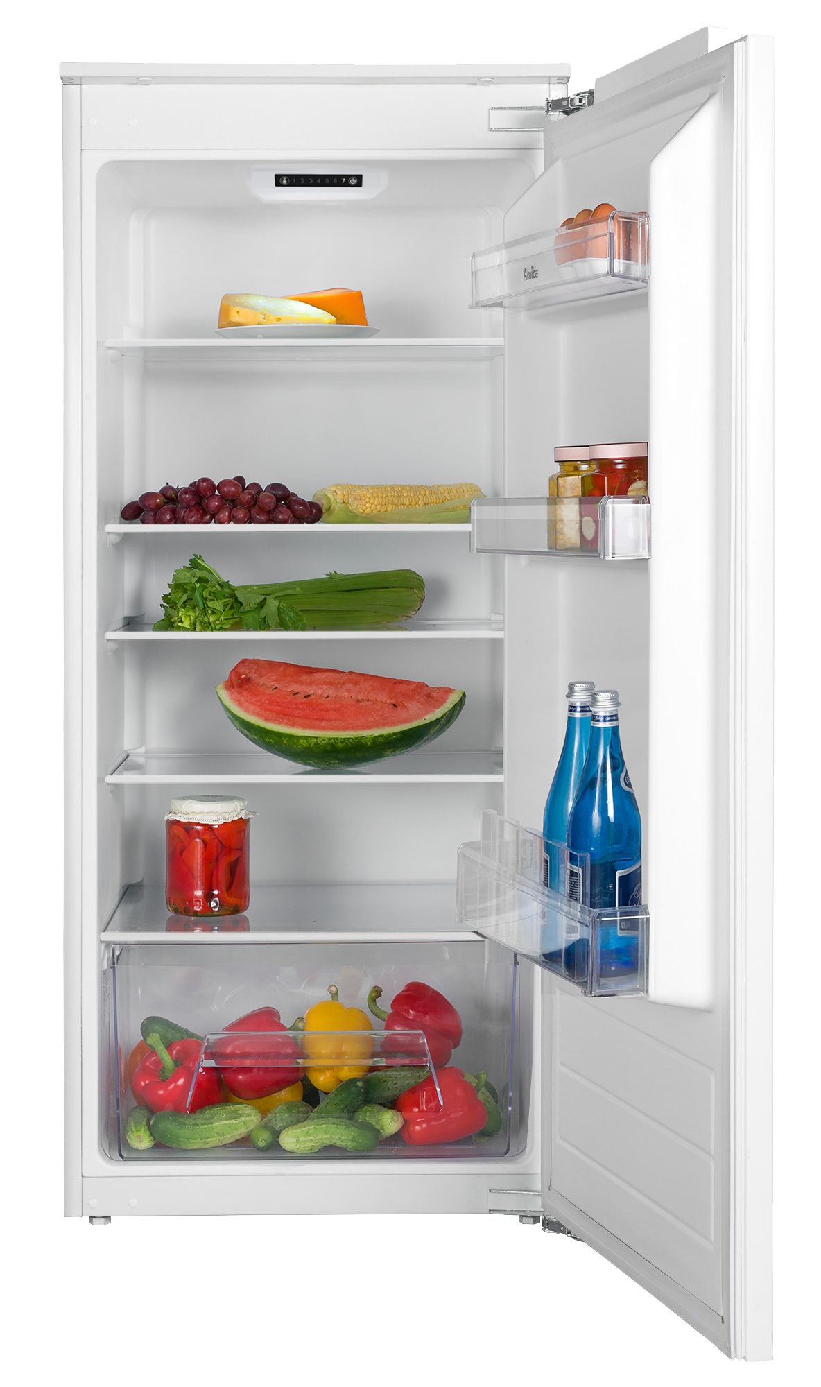 Der integrierbare Einbaukühlschrank »EVKS 16175« ist von der Marke Amica. Das Gerät bietet ausreichend Platz für deinen Einkauf durch seine Maße von 54 x 122,1 x 54 cm (B/H/T) und das Kühlvolumen von 197 l. Das Modell arbeitet mit einem Betriebsgeräusch von 35 dB. Auf fünf Ablageflächen aus Sicherheitsglas ist im Einbaukühlschrank genug Raum für Lebensmittel. Zusätzliche Flexibilität bei der Aufbewahrung bieten die drei Türablagen. Bei offen stehender Tür meldet dies der Einbaukühlschrank mit einem akustischen Warnsignal. Perfekte Übersichtlichkeit erhält man außerdem durch die LED-Innenbeleuchtung. Der »EVKS 16175« von Amica ist ein Einbaukühlschrank, der mit seinen Features überzeugt und genug Platz für Nahrungsmittel aller Art bietet.