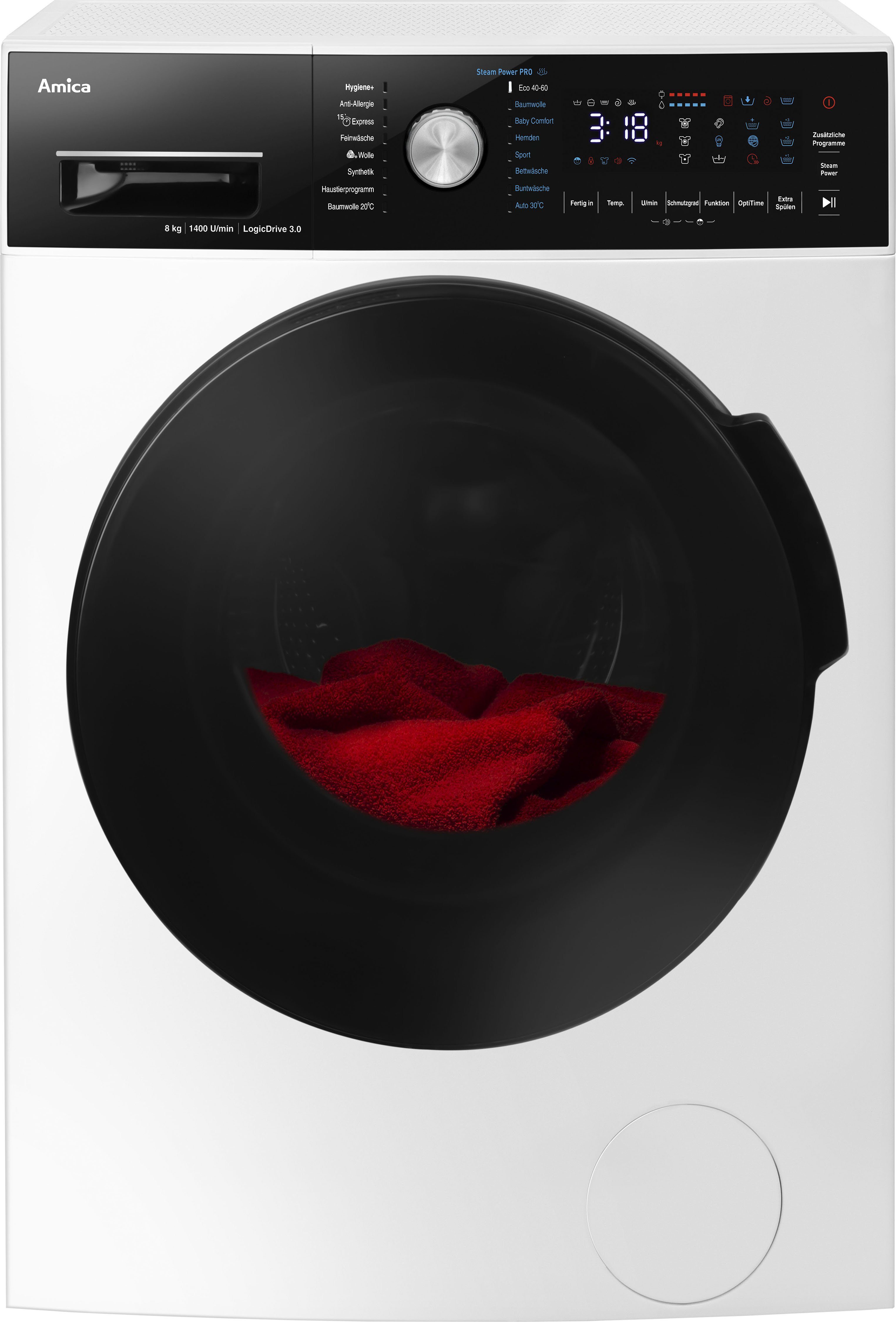 Die WA 484 091 ist eine Waschmaschine von Amica. Die Energieeffizienzklasse A (Skala: A bis G) zeichnet diese Waschmaschine als besonders sparsames Modell aus. Der Frontlader eignet sich vor allem für Haushalte mit bis zu 4 Personen, da dieser 8 kg Fassungsvermögen hat. Darüber hinaus bietet die WA 484 091 Waschmaschine unter anderem diese Top-Features: AquaStop, Extra Spülen, Kindersicherung und Schontrommel. Die Wassermenge wird durch die AutoSense-Technologie automatisch angepasst, denn sie erkennt über Sensoren, wie viel Wäsche sich in der Trommel befindet. Ist einmal zu viel Waschmittel in der Trommel, reagiert die Schaumerkennung und legt einen extra Spülgang ein. So bleiben keine Rückstände in Ihren Textilien. Anhand der Startzeitvorwahl lässt sich individuell einstellen, wann die WA 484 091 Waschmaschine mit dem Waschgang starten soll. Über die Restlaufanzeige ist jederzeit ersichtlich, wie viel Zeit von der Waschmaschine noch für den laufenden Waschgang gebraucht wird. Die Maße der Waschmaschine betragen 59,5 cm x 85 cm x 47,5 cm (BxHxT). Da die Waschmaschine im Vergleich zu anderen Geräten weniger Tiefe besitzt, wird es ebenfalls als Raumspargerät oder Slimgerät bezeichnet.