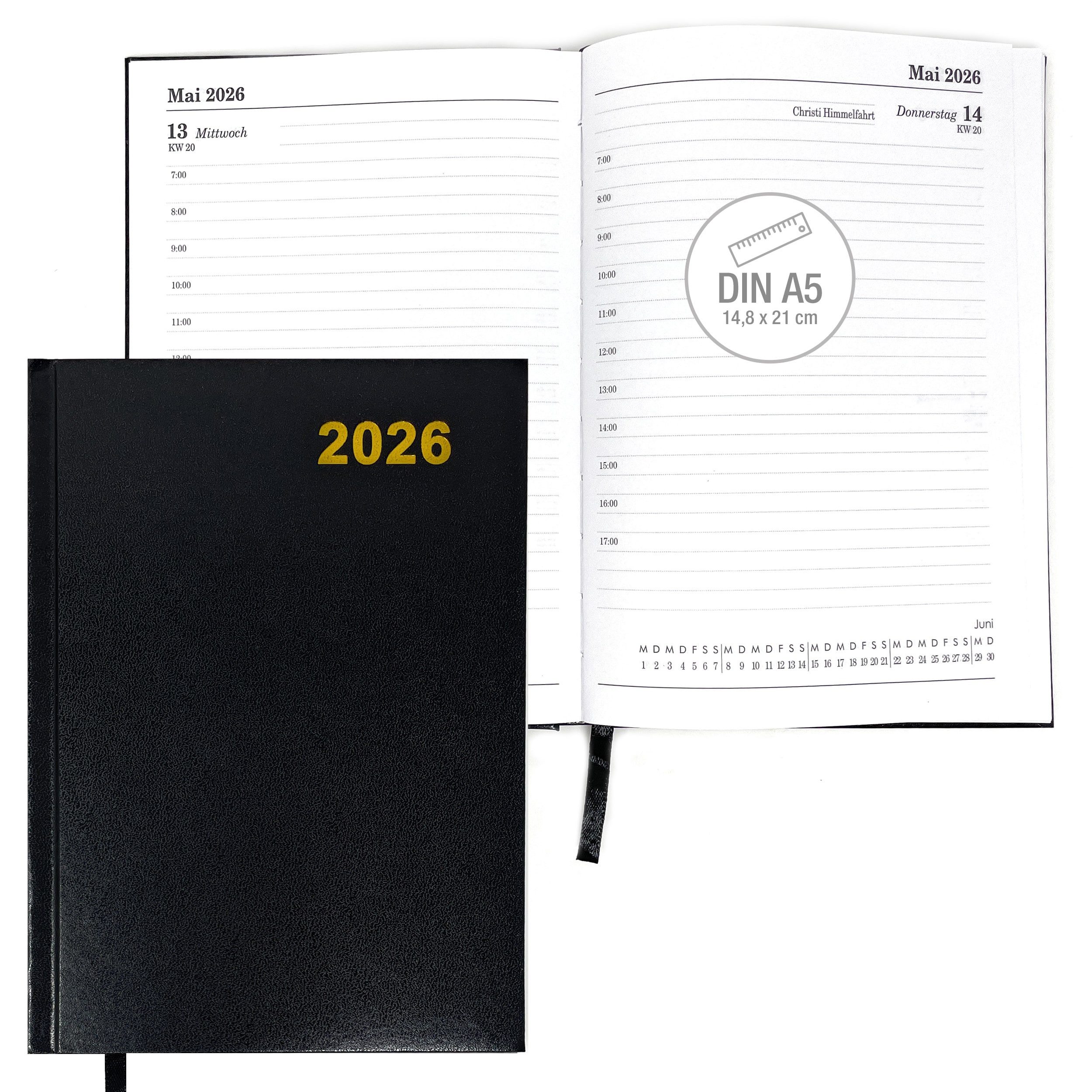 Organisiere deinen Alltag stilvoll – mit dem edlen Buchkalender 2026 im handlichen DIN A5 Format (14,8 x 21 cm).