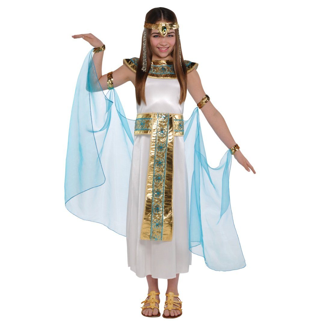 Diese traumhafte Cleopatra Kostüm für Kinder besteht aus einem langen weißen Kleid mit gold / blauem Kragen sowie Gürtel, Stirnband und Armreifen mit hellblauem Tüllumhang. Dieses wunderschöne ägyptische Komplett-Kostüm ist das Highlight zum Kinderfasching oder für das Schultheater. Lieferung ohne Schuhe.