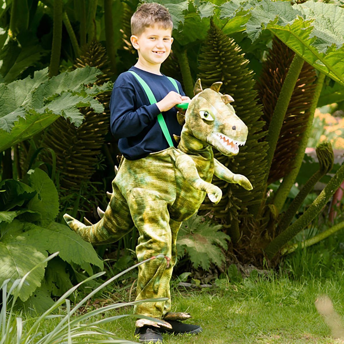 Kinder lieben Dinos, mit diesem tollen T-Rex Kostüm können Kinder zum Reiter der großen Echse werden. Dieses Huckepack Kostüm wird alle Jungen begeistern, die Dinosaurier lieben! Das Dinosaurier Kostüm besteht aus einer Hose mit entsprechendem Tierkörper. Die Hinterläufe sind für das Kind vorgesehen, einfach hineinschlüpfen und fertig ist die atemberaubende Verkleidung! Für den Betrachter sieht es nun so aus, als ob das Kind auf dem T-Rex sitzt. Die Echse ist äußerst detailreich und liebevoll gestaltet: der Körper ist grün-gelb gestaltet und in Schuppen-Optik designed. Die bronzenen Krallen fungieren als sogenannte Schuh-Überzieher. Das bedeutet, dass das normale Schuhwerk von den Krallen leicht verdeckt wird - die Verkleidung wirkt dadurch realistischer. Die Vorderläufe sind ausgestopft. Das Maul ist leicht geöffnet, so sind die zahlreichen scharfen Zähne des T-Rex gut sichtbar. Die hellgrünen Hosenträger sorgen für einen optimalen Sitz, mit einem Band, welches am Hinterkopf des Dinosauriers befestigt ist, kann der Kopf aufrecht gehalten werden. Ein wunderschönes Kostüm, das spielerisch die Fantasie Ihres Kindes anregt