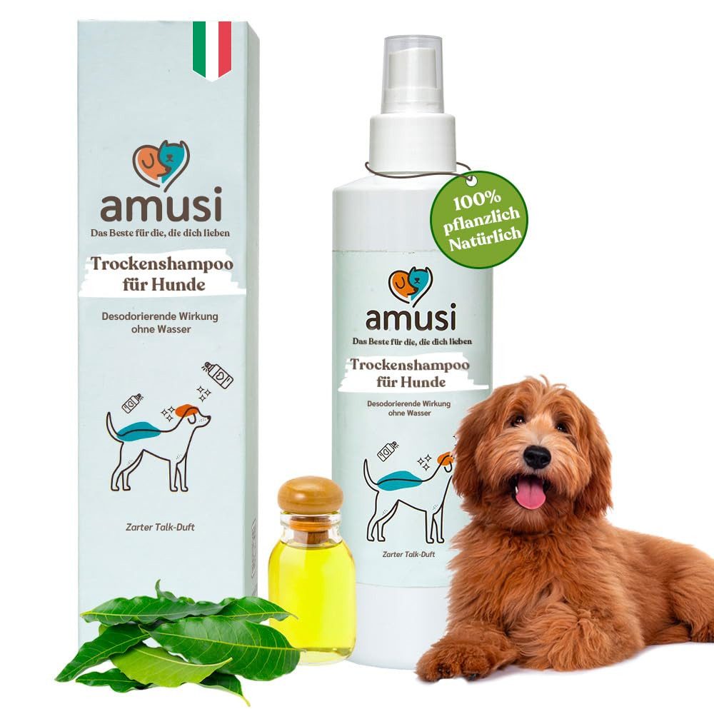 Das amusi Spray für Hunde ist ein hochwertiges Hundeshampoo, das speziell entwickelt wurde, um Juckreiz zu lindern und das Fell Ihres Hundes zu pflegen. Es ist hypoallergen, pH-neutral und vegan, was es zu einer sicheren Wahl für empfindliche Hunde macht.