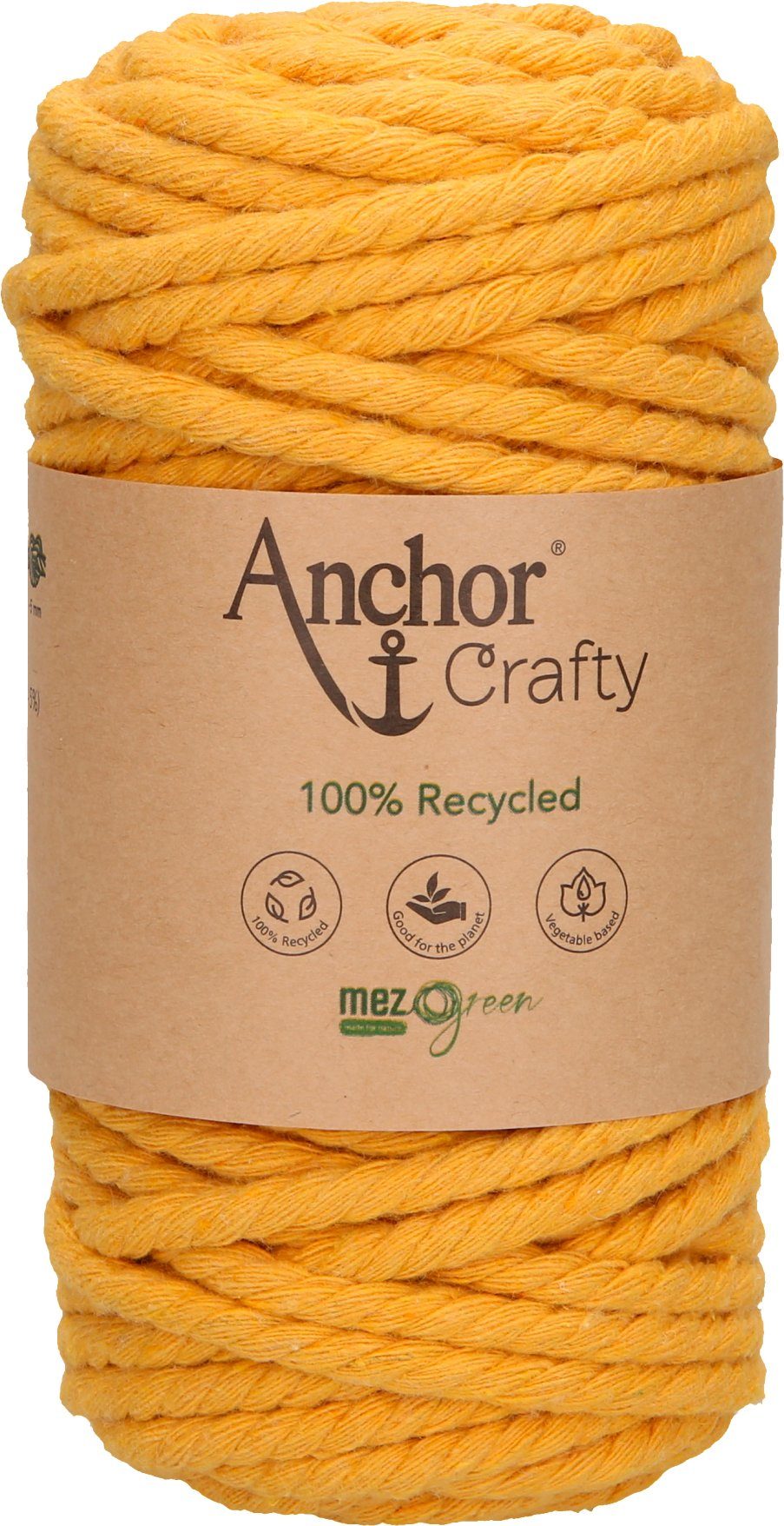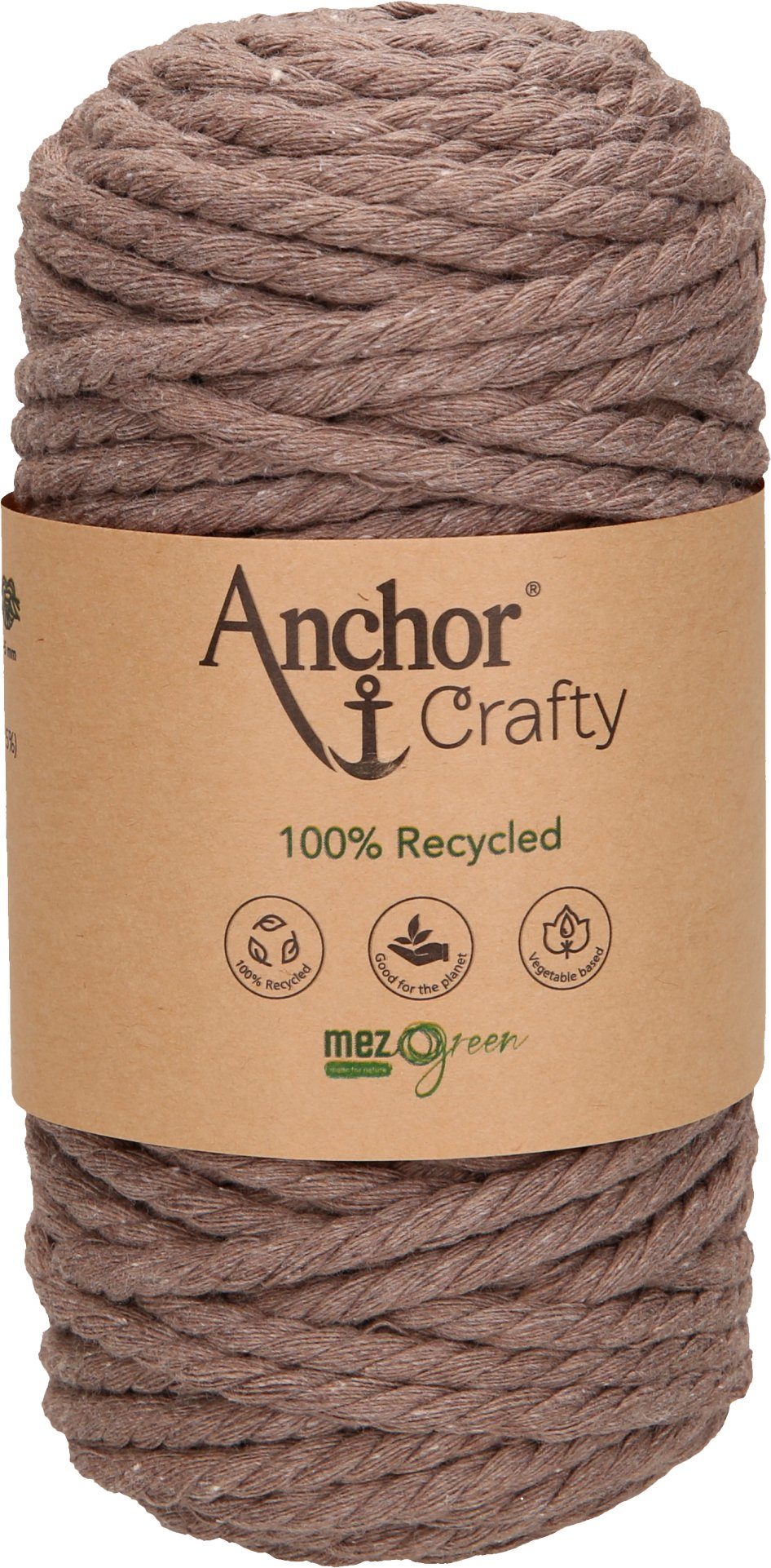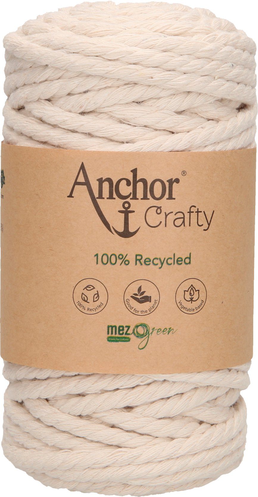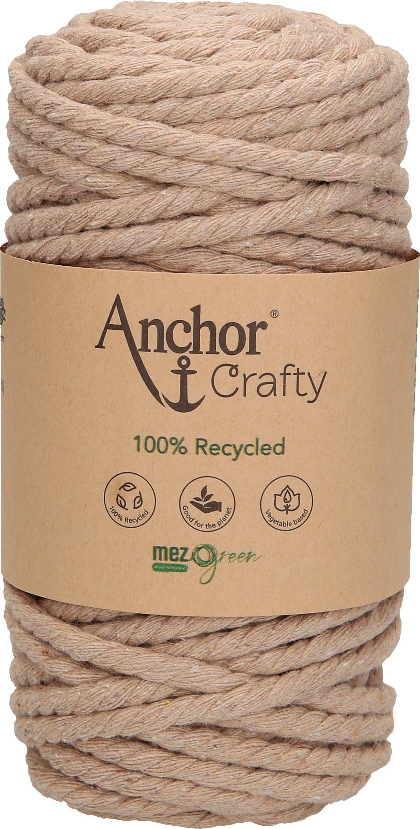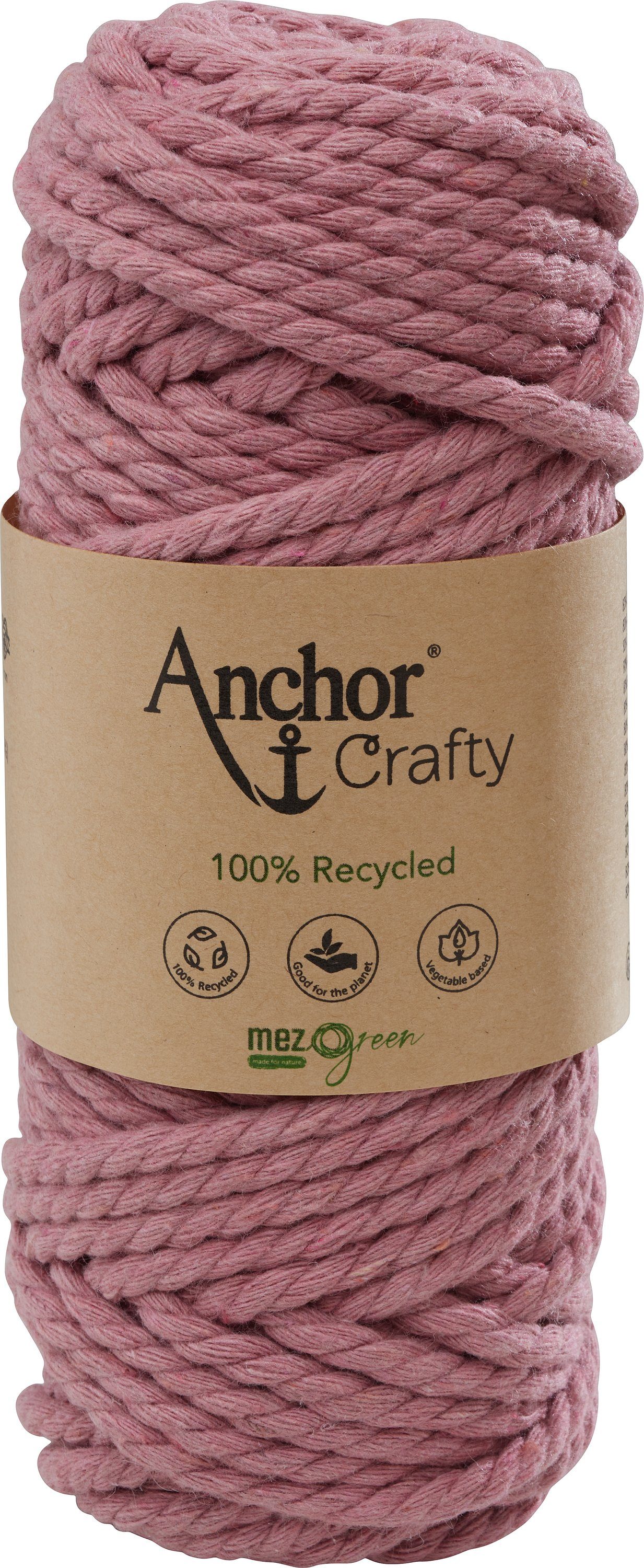 Anchor Crafty, ca. 250 g schwer mit einer Lauflänge von ca. 40 m und einer Stärke von ca. 5 mm. Die 3-fach gedrehte Kordel besteht aus 100 % Recycling Garn, das sich aus 80 % Baumwolle und 20 % Polyester zusammensetzt. Auf Pflanzenbasis gefärbt. Leicht zu verarbeiten mit einem besonders weichen Griff. Eine umweltfreundliche und nachhaltige Kordel, die auch von Anfängern für schnelle Projekte genutzt werden kann. Besonders für die Makrameetechnik im typischen Boho-Look geeignet, da sich die Kordel leicht aufdrehen und fransen lässt. Ideal für Wandbehänge, Untersetzer, Blumenampeln und Schlüsselanhänger. Kann sogar für Häkel- und Strickarbeiten verwendet werden. Hier eignet sich eine Nadelstärke von 10 – 12.