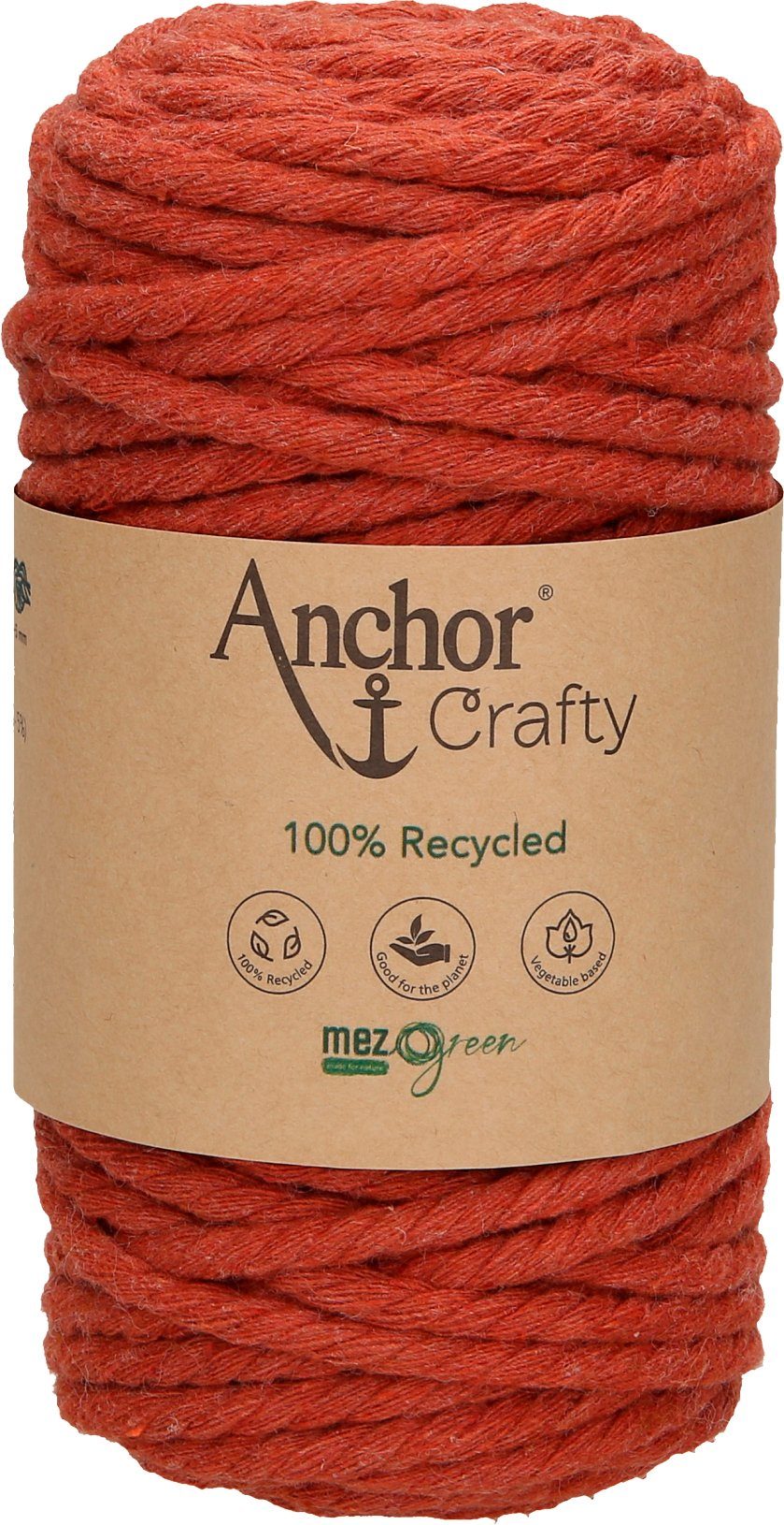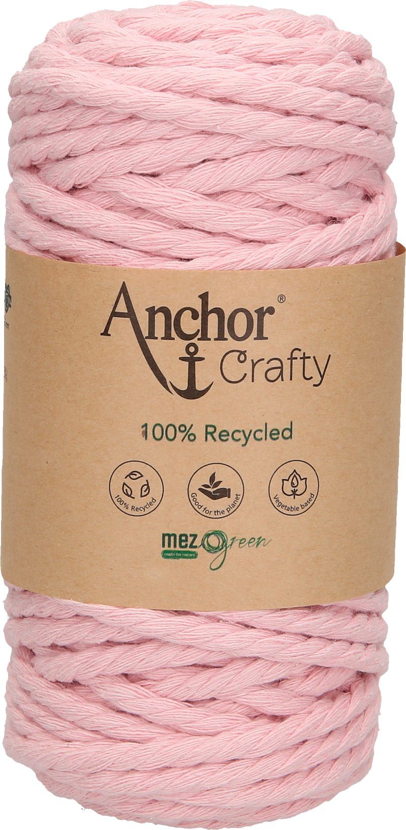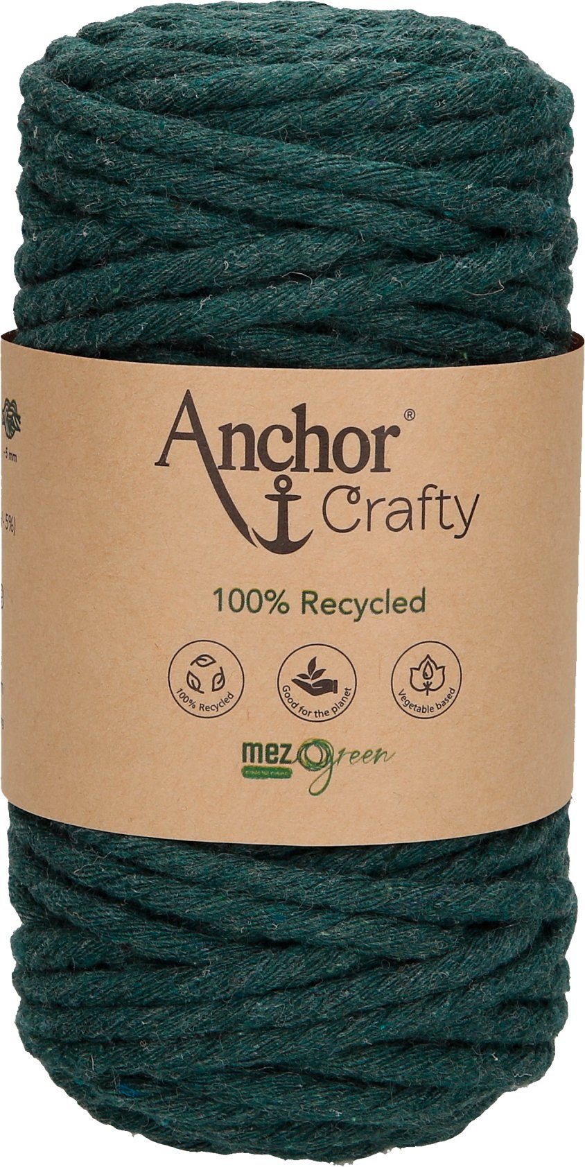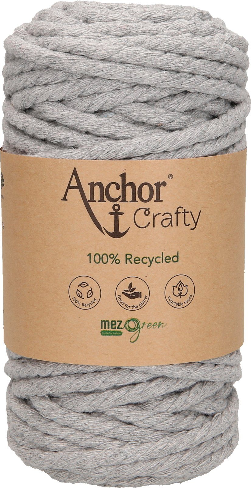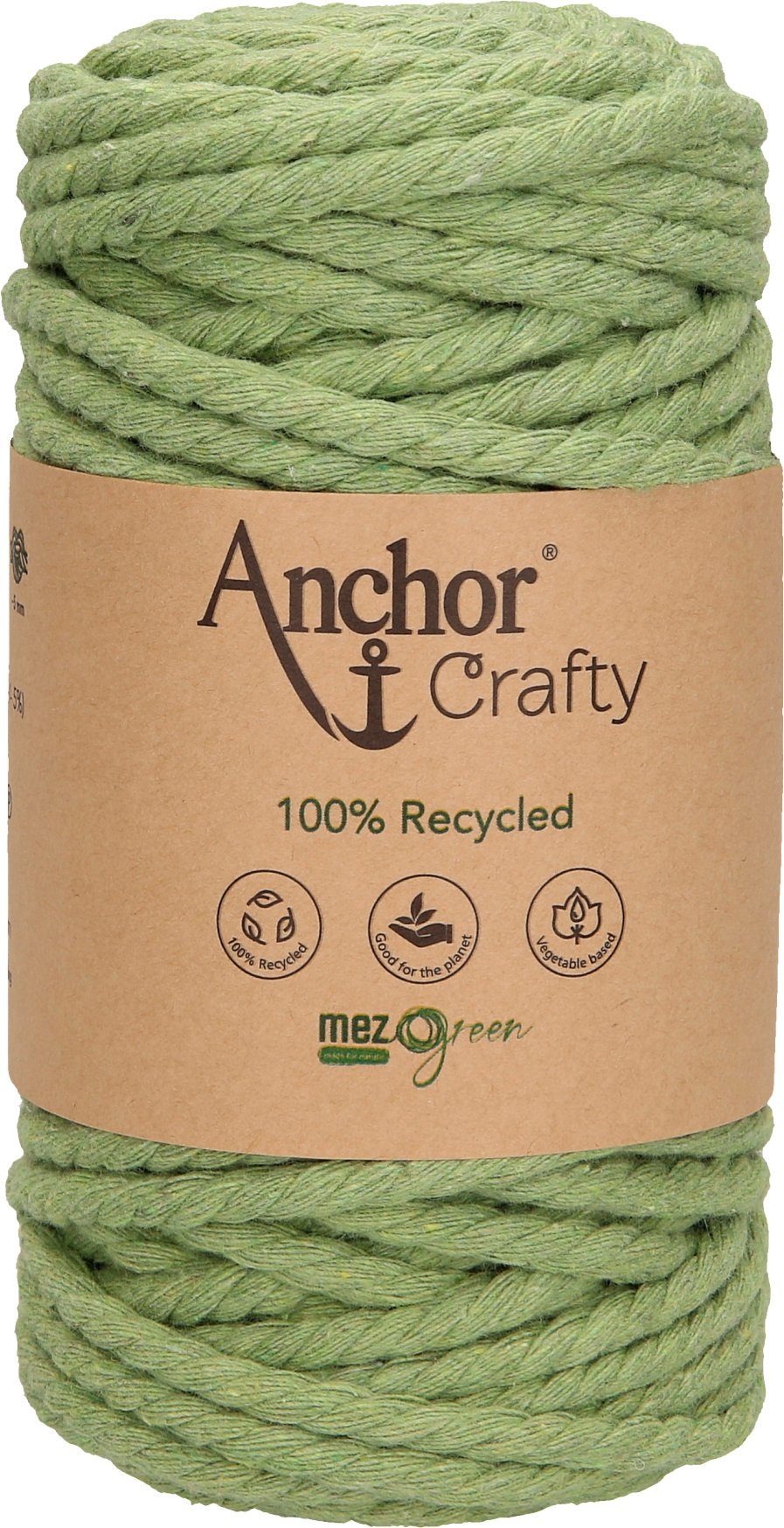 Anchor Crafty, ca. 250 g schwer mit einer Lauflänge von ca. 40 m und einer Stärke von ca. 5 mm. Die 3-fach gedrehte Kordel besteht aus 100 % Recycling Garn, das sich aus 80 % Baumwolle und 20 % Polyester zusammensetzt. Auf Pflanzenbasis gefärbt. Leicht zu verarbeiten mit einem besonders weichen Griff. Eine umweltfreundliche und nachhaltige Kordel, die auch von Anfängern für schnelle Projekte genutzt werden kann. Besonders für die Makrameetechnik im typischen Boho-Look geeignet, da sich die Kordel leicht aufdrehen und fransen lässt. Ideal für Wandbehänge, Untersetzer, Blumenampeln und Schlüsselanhänger. Kann sogar für Häkel- und Strickarbeiten verwendet werden. Hier eignet sich eine Nadelstärke von 10 – 12.