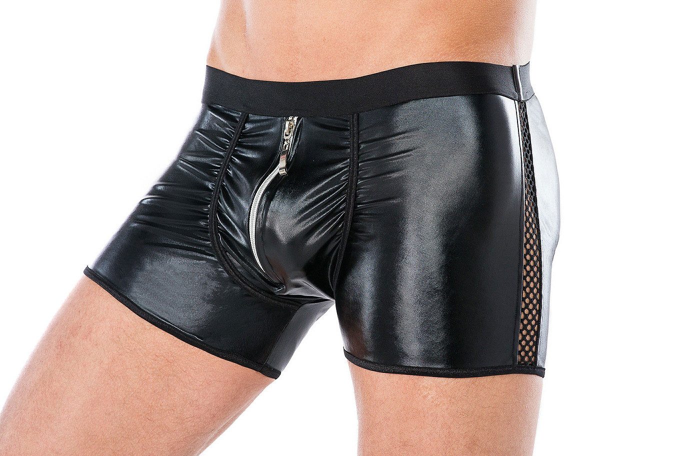 Herren Boxer-Shorts in wetlook schwarz. Schwarze Boxershorts aus Wet-Look-Material mit Reißverschluss und Netzstreifen auf der Vorderseite. Все Metallteile sind nickelfrei. In exklusiver, neutraler Geschenkverpackung in mattschwarz!