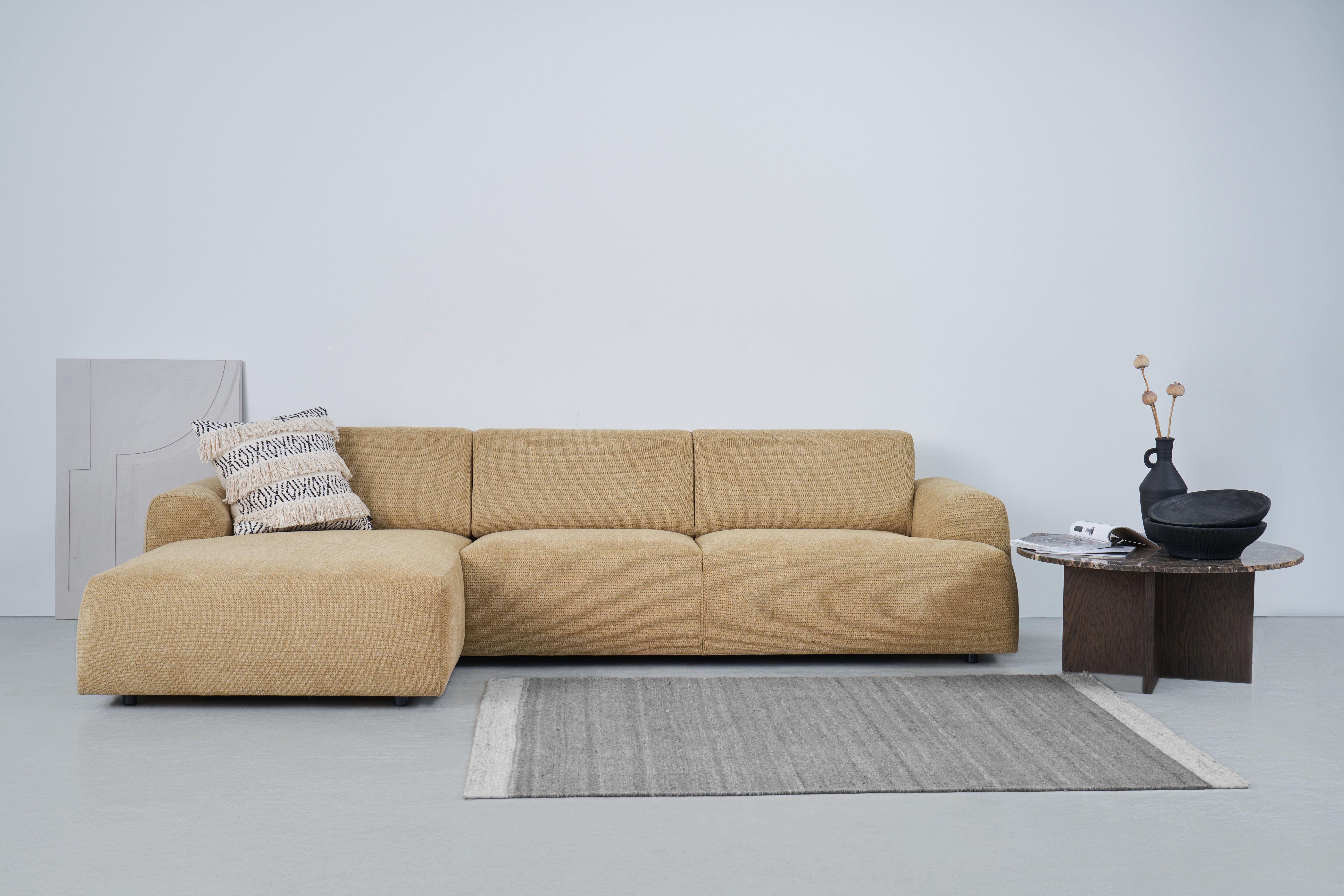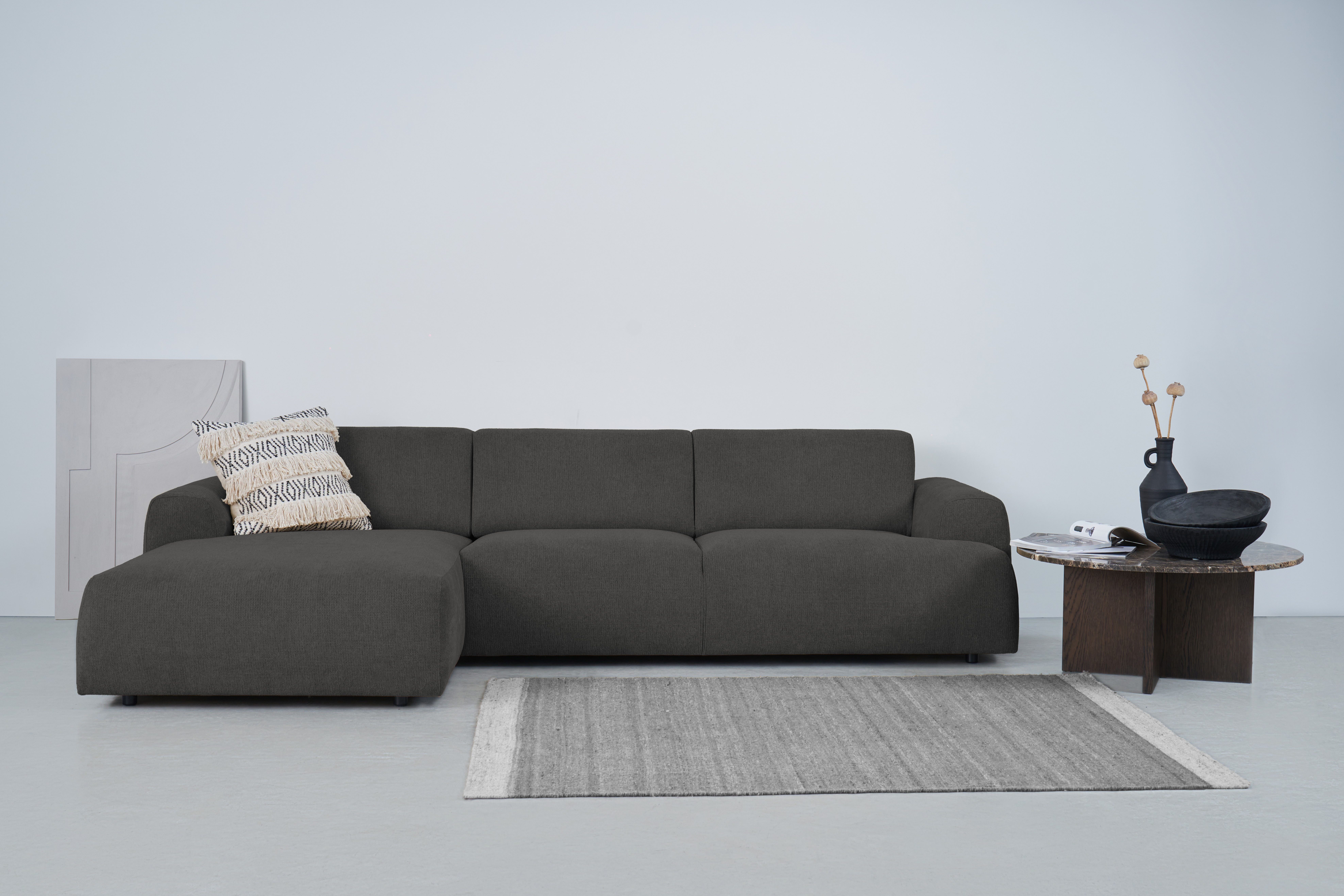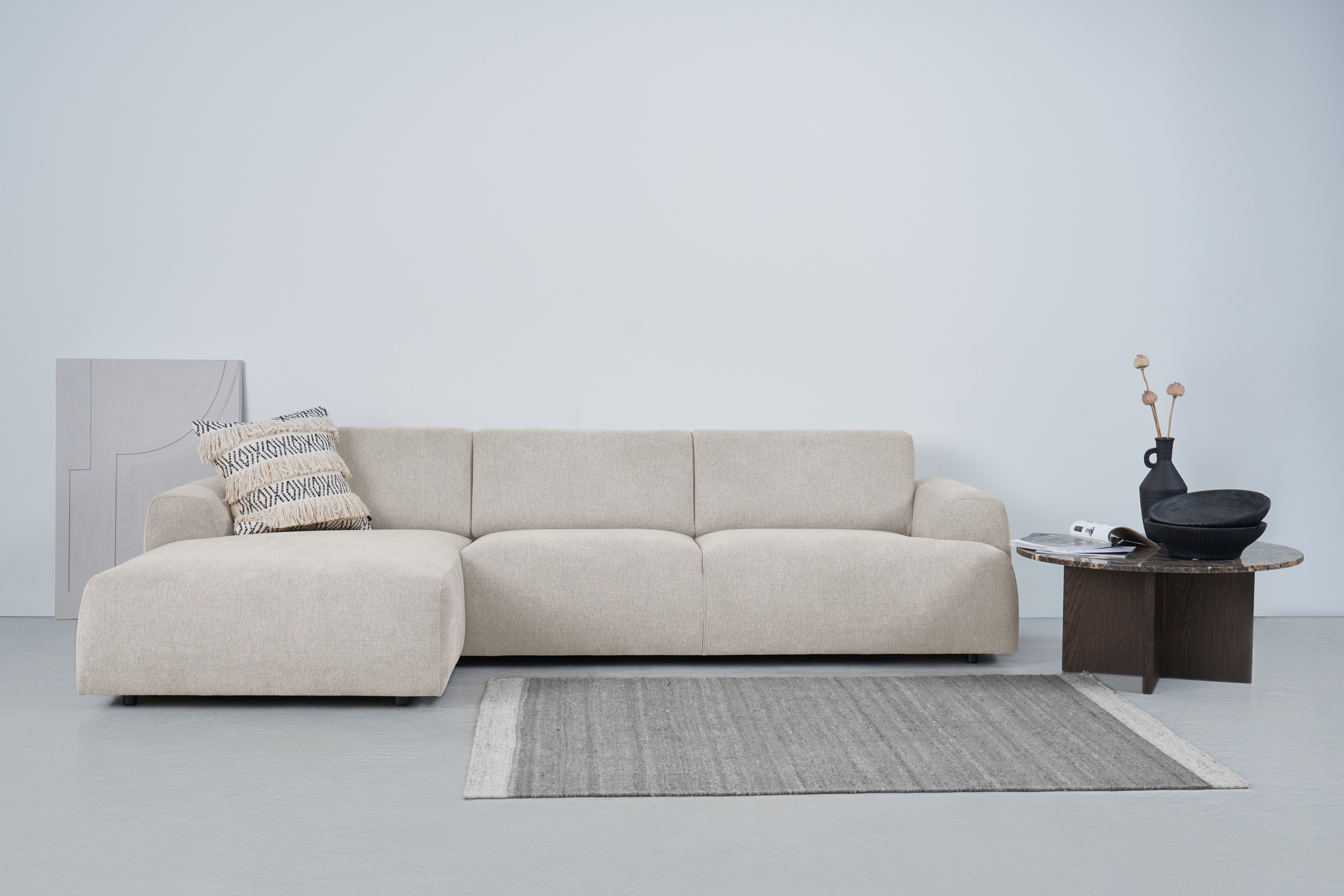 Durch die hochwertige Wellenunterfederung wird die Sitzfläche des Ecksofas »Linkka, Breite 301 cm« von andas gut gefedert und bleibt dauerhaft elastisch. Von vorne betrachtet ist die Recamiere nach links ausgerichtet. Bei etwa 480 Kilogramm liegt die maximale Belastbarkeit. Der Chenille-Webstoff zeigt sich mit einer schicken samtig wirkenden Oberfläche, die dem Velours ähnelt.