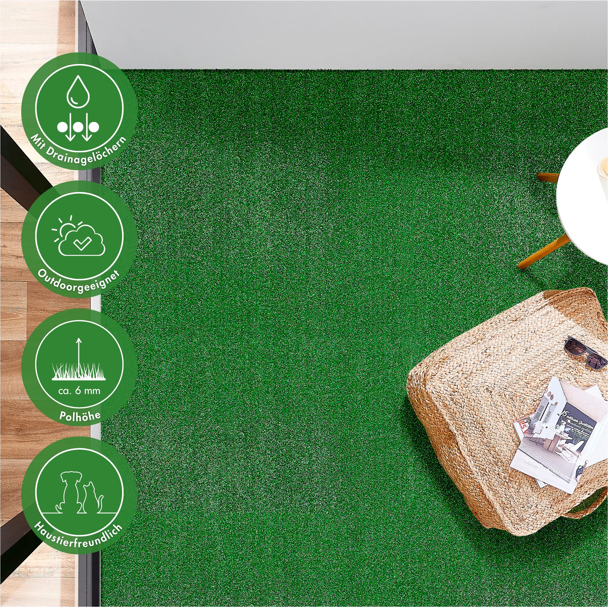 Der stilvolle grüne Kunstrasen präsentiert sich als zeitlose Alternative zum echten Rasen. Mit seinem modernen Charme verleiht er Ihrem Außenbereich eine frische und lebendige Atmosphäre, und das bei minimaler Pflege. Aufwendiges Mähen, Gießen oder Düngen entfällt, was Ihnen Zeit und Mühe erspart. Optimal geeignet für Terrassen, Balkone, Wintergärten, Campingplätze oder Wohnwagen sowie als Unterlage für Pools bietet unser grüner Kunstrasen vielseitige Anwendungsmöglichkeiten. Dank seiner Wasserdurchlässigkeit wird die Bildung von Pfützen vermieden, während seine hohe Strapazierfähigkeit auch anspruchsvollen Bedingungen standhält. Der grüne Kunstrasen ist in verschiedenen Größen erhältlich und überzeugt durch seine Langlebigkeit: Er ist unempfindlich gegenüber Verschmutzungen, UV-beständig und verfügt über integrierte Drainagelöcher, die einen reibungslosen Wasserabfluss gewährleisten. Ein besonders überzeugendes Argument für den grünen Kunstrasen liegt darin, dass er dauerhaft sein frisches Grün behält. Egal, ob auf der Terrasse, dem Balkon oder im Garten - dieser grüne Kunstrasen ist die optimale Wahl für alle, die ihren Outdoor-Bereich mit Stil und Natürlichkeit aufwerten möchten.