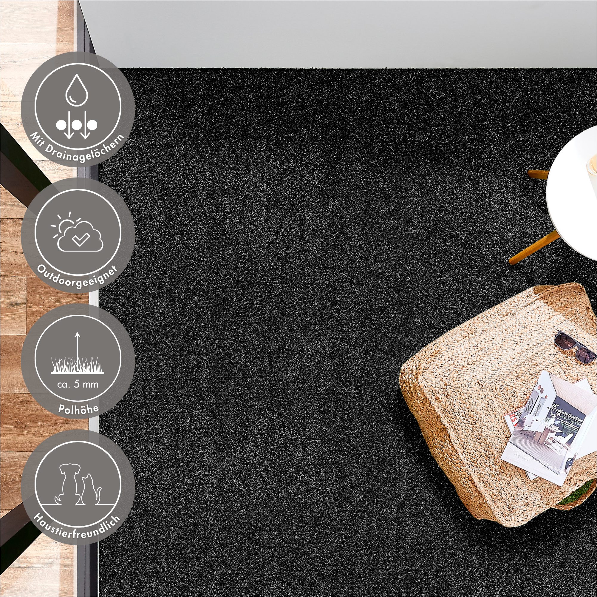 Strapazierfähig und langlebig: UV-beständig, schmutzabweisend und mit Drainagelöchern bleibt der Teppich auch bei extremem Wetter stets ansehnlich und funktional