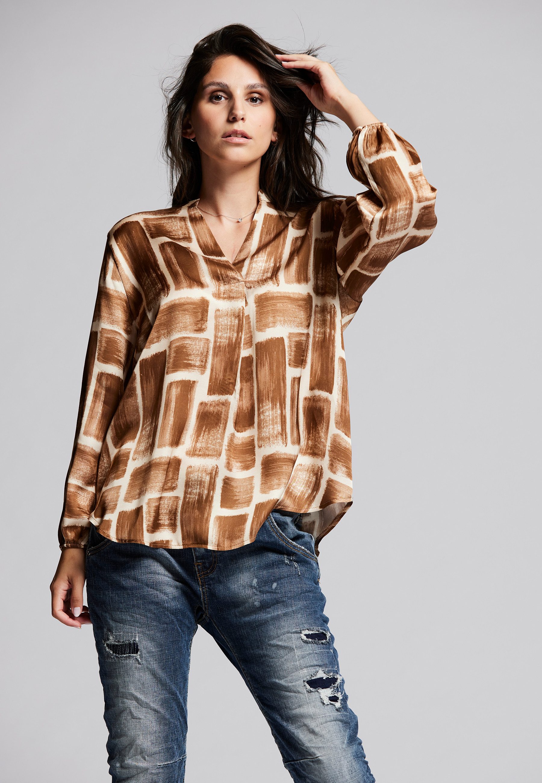 Die BLUSE CHECK IT wurde aus einer hochwertigen, fließenden Viskose-Satin Qualität gefertigt.