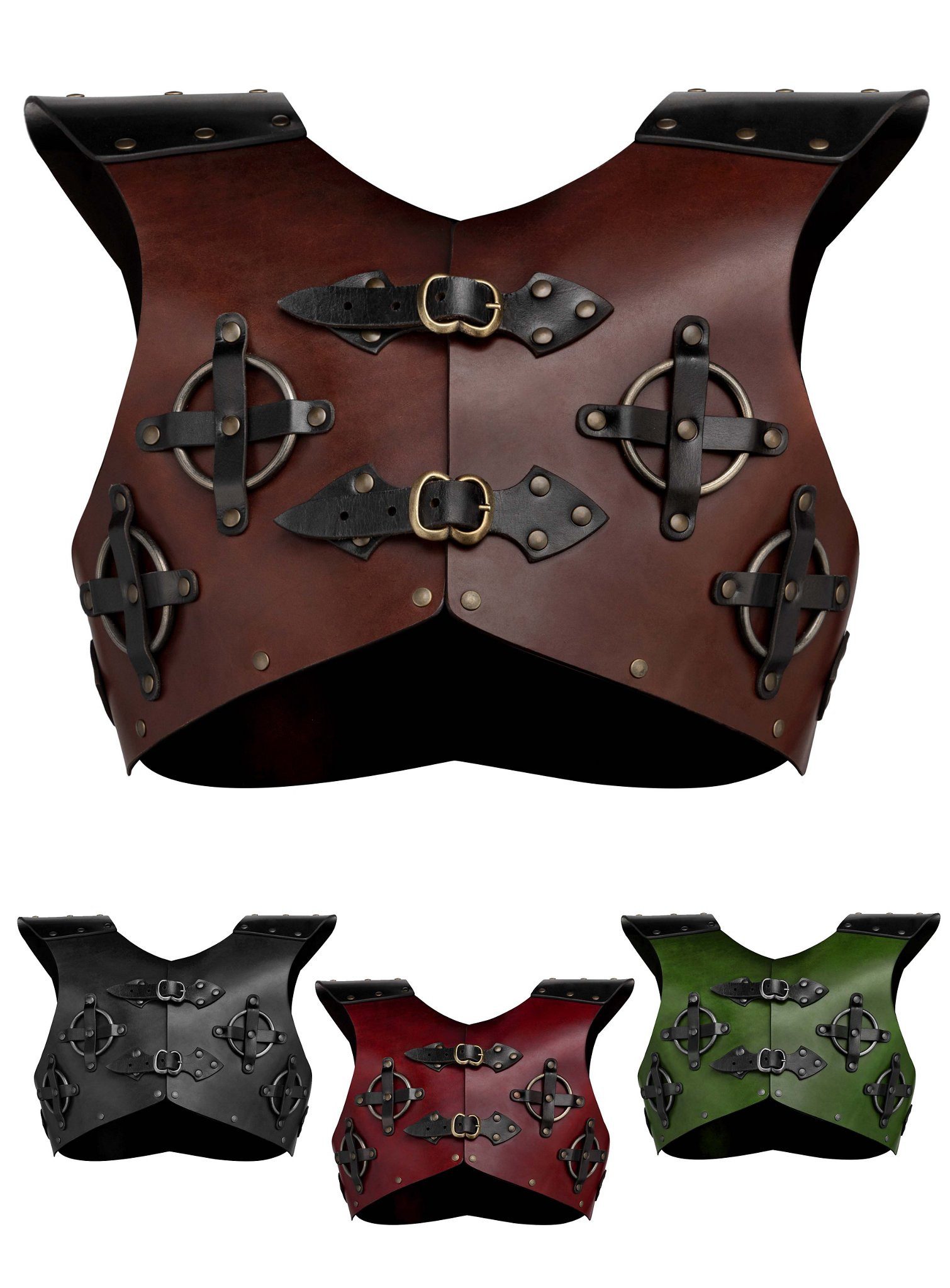 Dieser robuste Brustschutz aus Leder ist von der Bärenschulen-Ausrüstung aus dem Fantasy-Game Witcher Wild Hunt inspiriert. Die soliden Ringe auf der Brust geben dem Rüstungsteil seinen ikonischen Charakter. Ob nun zum Monsterjagen, als Verstärkung über einem Kettenhemd, oder um sich wie Geralt von Riva zu fühlen, in dem Hexer-Brustschutz machst du auf jeden Fall eine gute Figur. An dem Brustschutz aus Leder lassen sich auch Schultern anbringen.