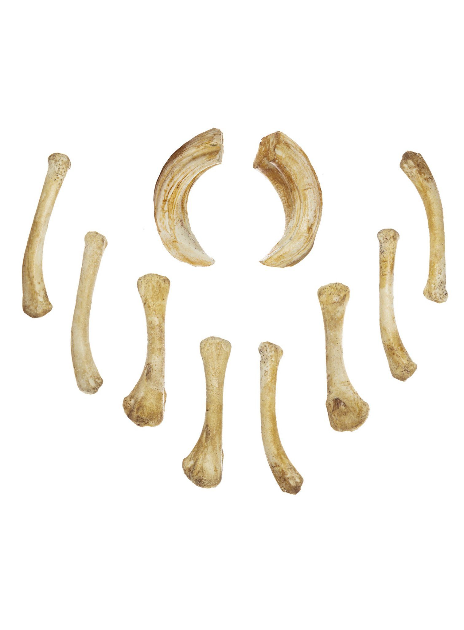 Die Knochen wurden von Hühnerknochen abgegossen und die Tierzähne von Wildschweinhauern. Sie sind handbemalt, wodurch sich die realistische Optik ergibt.
