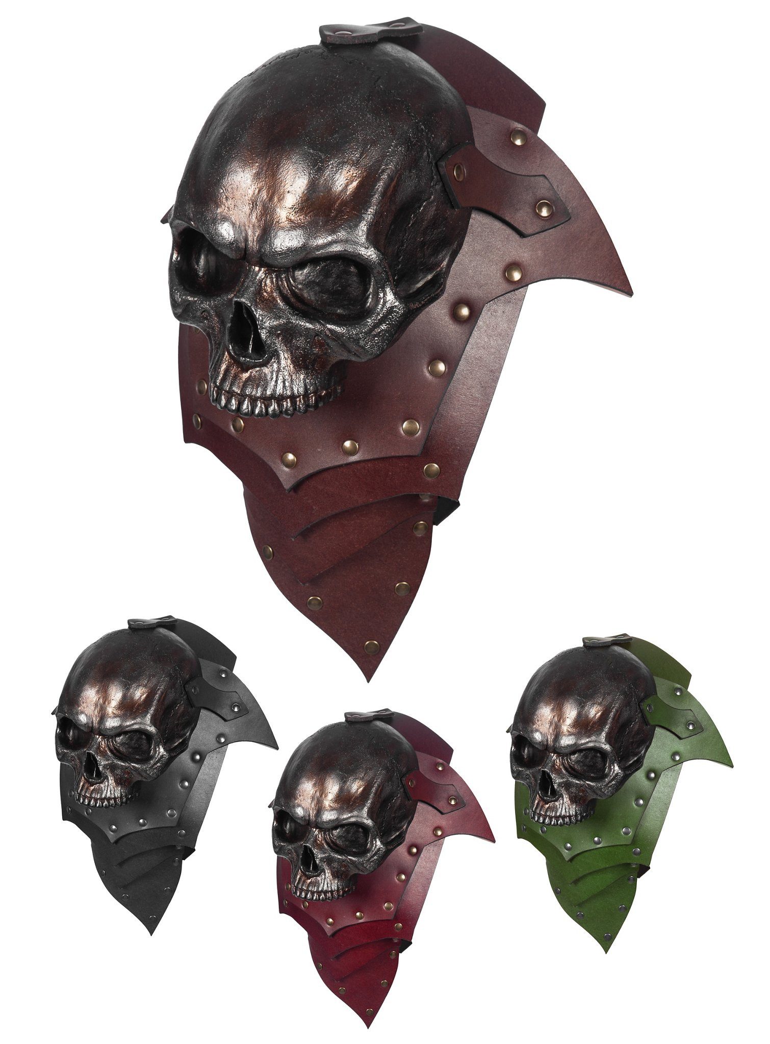 Der Schädel ist aus sehr robustem Gießharz gefertigt und hält selbst heftigstem Kampfgetümmel stand. Die Schulter besteht aus einer Schulterkugel und einer Armplatte, die mit Lederriemen verbunden sind. So bleibt man extrem beweglich.