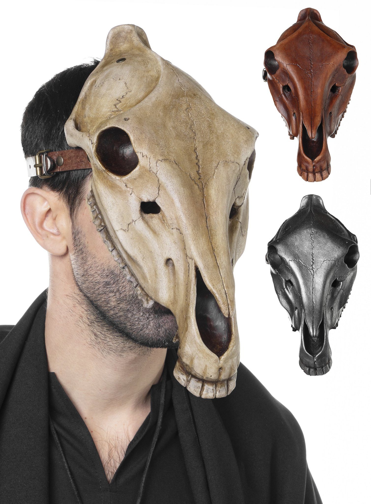 Dieser dekorative Tierschädel ist einem leicht verkleinertem Pferdekopf nachempfunden. Die Polsterung auf der Innenseite sorgt für einen bequemen Sitz. Die Schädel Maske ist perfekt anpassbar an den Träger, durch die zwei Riemen aus Leder auf der Rückseite. Die Pferde Maske ist ein tolles Accessoire für Schamanen, Priester oder sogar Untote. Auch als Kopfschmuck ziert sie jede Hexe, Schamane, Barbar oder Magier-Charaktere. Sie ist sehr stabil und hält Larp Kämpfen und Schlägen mit Polsterwaffen stand. Diese Maske aus Kunstharz wird handgefertigt und bemalt in Berlin von unserer Andracor Werkstatt. Damit ist jeder Schädel ein kleines Unikat.