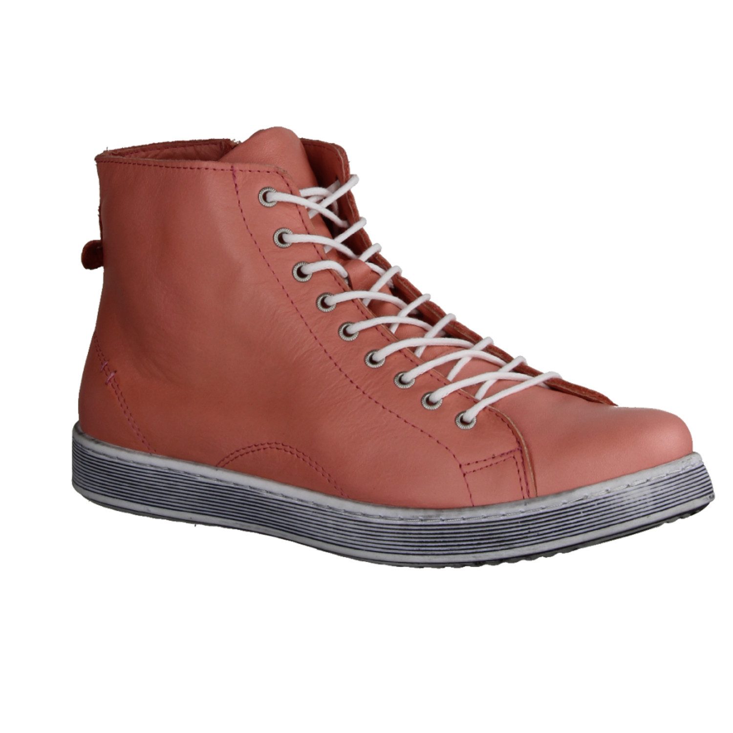 Der rosafarbene Hightop Sneaker gefälllt durch seine klare Linie und dem butterweichen Leder. Der weiße Sohlenrand ist mit schwarzen Streifen durchsetzt und unterstreicht mit den dünnen Senkeln das sportive Design. Während die 9-Loch-Schnürung einen perfekten Sitz garantiert, unterstützt der seitliche Reißverschluss ein schnelles An- und Ausziehen. Gepolsterte Zunge und wechselbares Lederfußbett stehen für den hohen Tragekomfort. Da der Schuh im Innenraum keine störenden Nähte aufweist eignet er sich im Sommer hervorragend als Barfuß-Schuh. Mit grauen Ersatzsenkel.