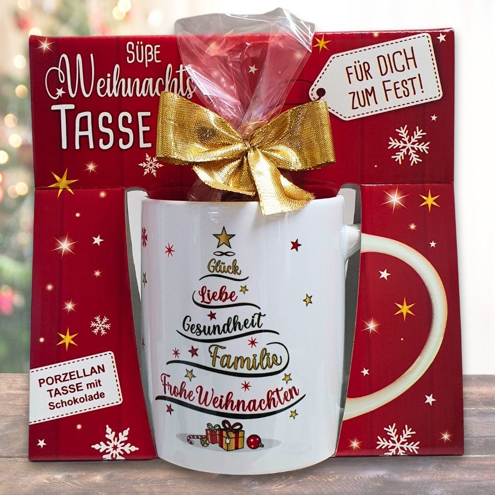 Verschenken Sie pure Weihnachtsfreude mit unserer liebevoll gestalteten Weihnachtstasse im Weihnachtsbaum-Design! Dieses bezaubernde Set besteht aus einer hochwertigen Keramik-Tasse mit einem beidseitigen festlichen Druck und einem süßen Extra: einer Tüte köstlicher Schokoladen-Krokant-Pralinen, hübsch verpackt mit einer glänzenden goldenen Schleife. Die Tasse zeigt ein niedliches Rentier, umgeben von Weihnachtskugeln und Sternen – perfekt, um in festliche Stimmung zu kommen. Süße Weihnachtstasse Geschenk Tasse aus Keramik - Weihnachtsbaum - mit Pralinen aus Schokolade und Krokant in festlicher Weihnachtsverpackung zu Weihnachten