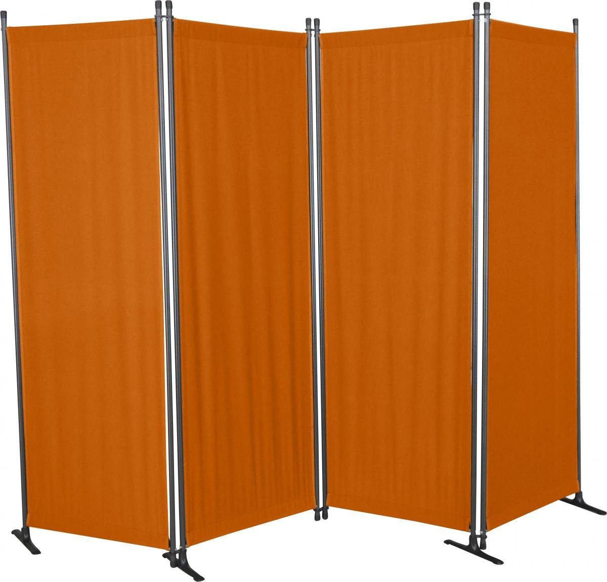 Der 4-teilige Paravent mit terracottafarbenem Bezugstoff ist der ideale Sichtschutz für den Innen- und Außenbereich. Die einzelnen Elemente können miteinander verbunden und beliebig erweitert werden. Zusammengefaltet ist der Paravent besonders platzsparend.