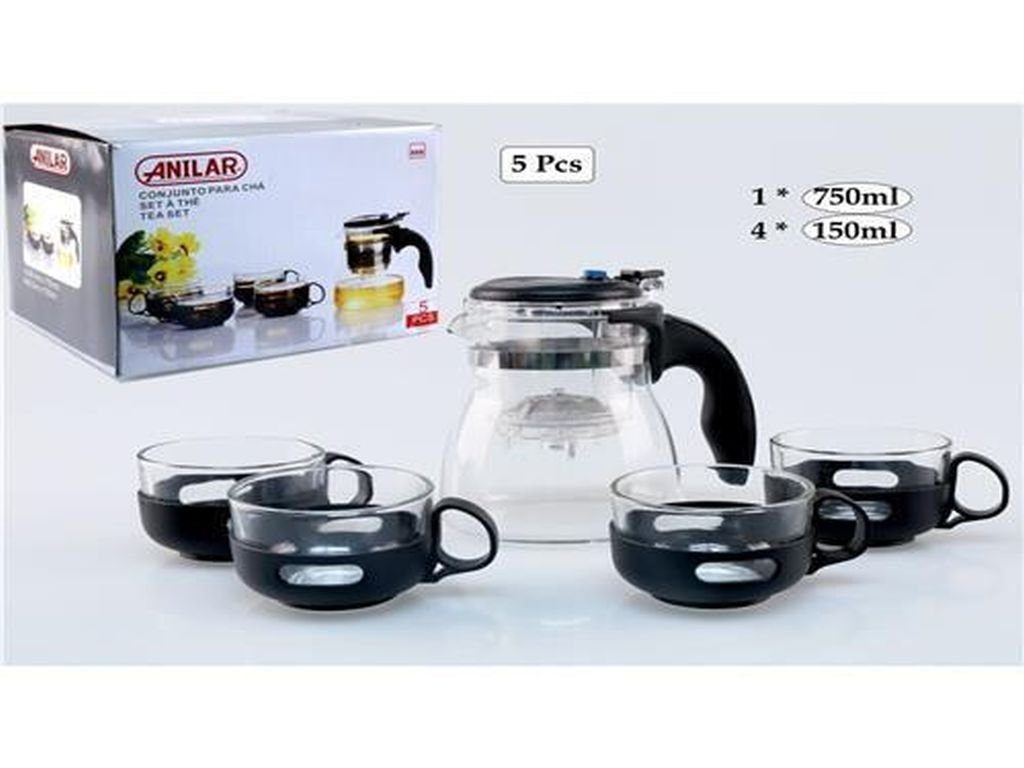 Glas Teekanne mit abnehmbare Edelstahl-Sieb Teebereiter 750 ml mit 4 x Tassen 150ml . Die Kanne hat eine Ausguss-Öffnung und ist somit sowohl für den privaten als auch für den gastronomischen Bereich geeignet. Das Sieb ist aus edlem Edelstahl und rostfrei. Details: Material: Kunststoff Kapazität: 750 ml Farbe: schwarz Lieferumfang: 1 x Glas Teekanne 1500 ml, 4 x Tassen 150 ml
