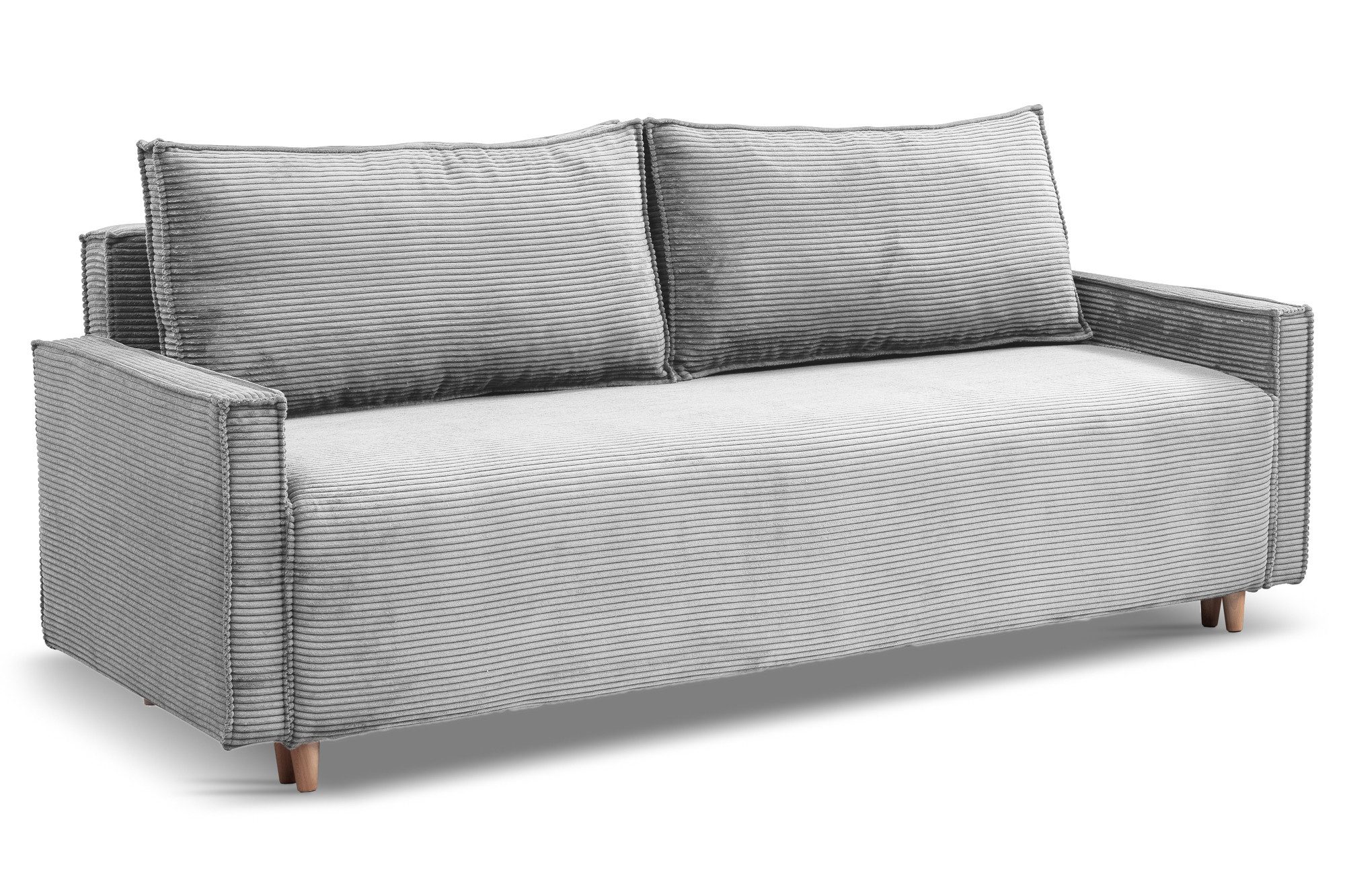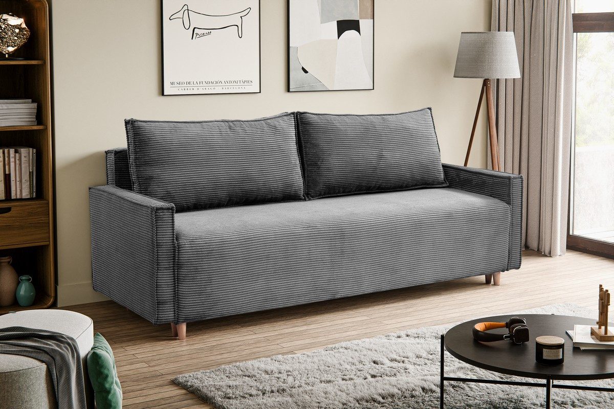 Die Schlaffunktion verwandelt das Sofa schnell in eine bequeme Schlafmöglichkeit. Der geräumige Bettkasten sorgt für zusätzlichen Stauraum. Zwei Rückenkissen erhöhen den Sitzkomfort, während die hohen Beine für eine moderne Optik sorgen und die Reinigung erleichtern.