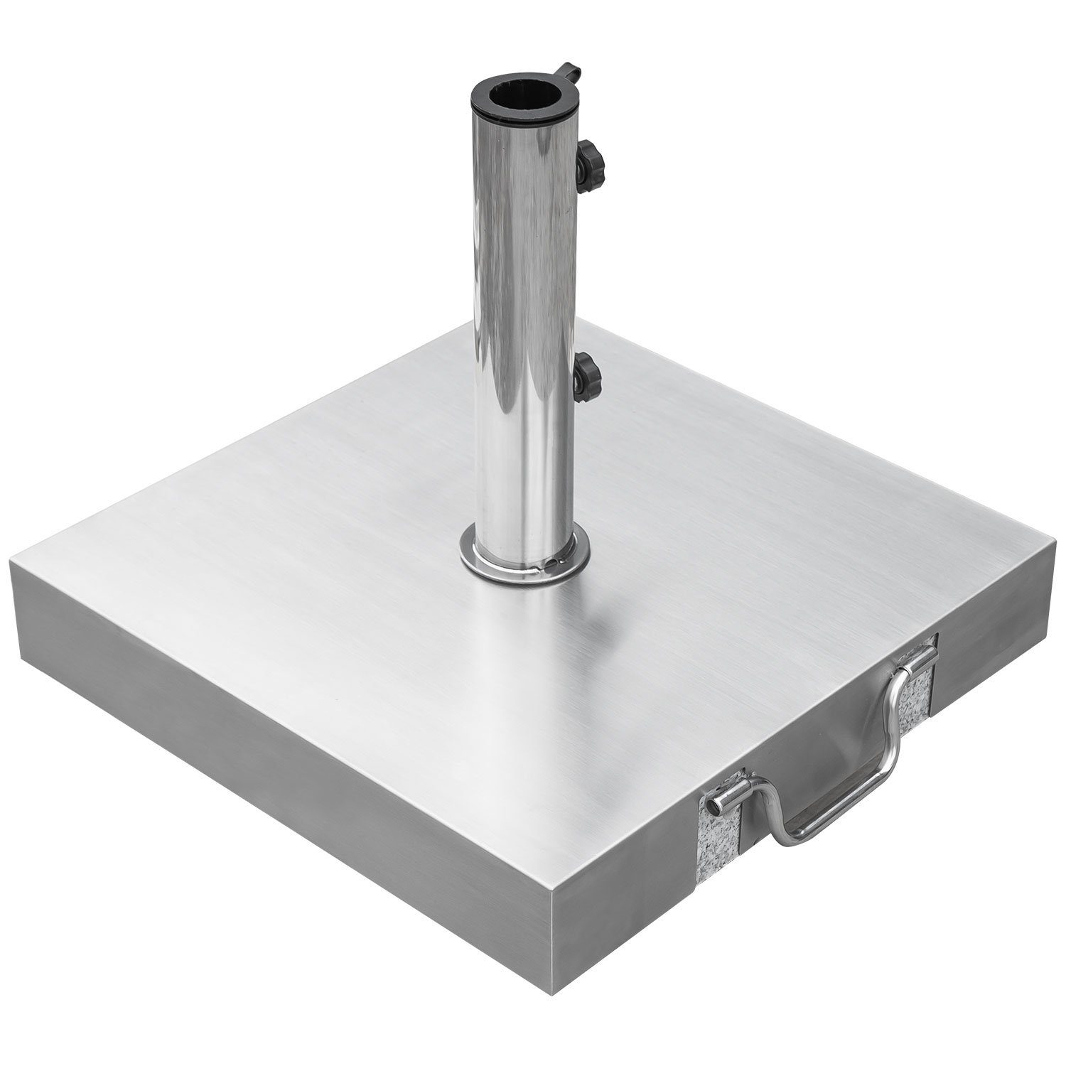 Der Sonnenschirmständer aus Granit mit einer Hülle aus Edelstahl ist passend für Schirme mit einer Stammdicke bis 48 mm. Ein seitlicher Edelstahlgriff und zwei stabile Kunststoffrollen an der Unterseite erleichtern die Platzierung dieses 40kg Edelstahl Ständers. Die Schirmaufnahme ist aus rostfreiem Edelstahl. Einfach den passenden Adapter für Ihren Schirm in den Schirmständer einsetzen und den eingeführten Stamm mit den Fixierschrauben festklemmen. Mitgeliefert werden zwei Adapterringe für 48 und 38mm. Der Schirmständer ist für Holz- und Aluminiumschirme gleichermaßen geeignet. Mit seinem Standgewicht von 40kg empfehlen wir diesen Sonnenschirmständer für mittelgroße Schirme.