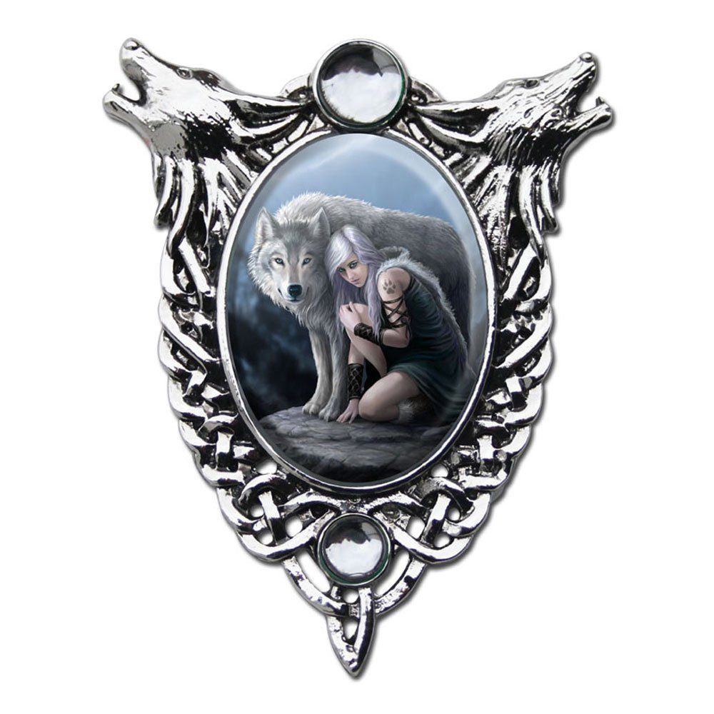 Wunderschöner Cabochon mit Anne Stokes "Protector" Motiv, eingefasst in zwei heulende Wölfe mit keltischen Knotenverzierungen und mit zwei klaren runden künstlichen Kristallen in der Einfassung verziert.